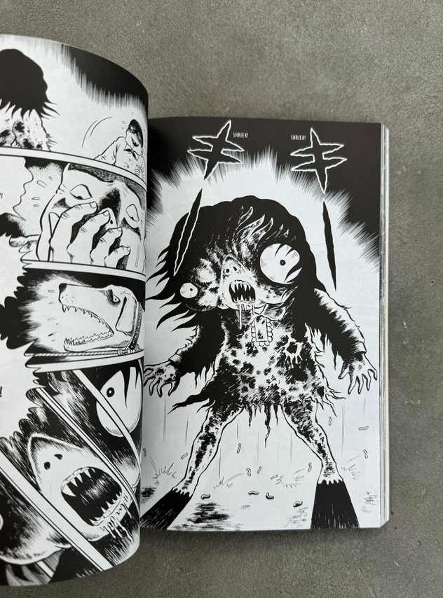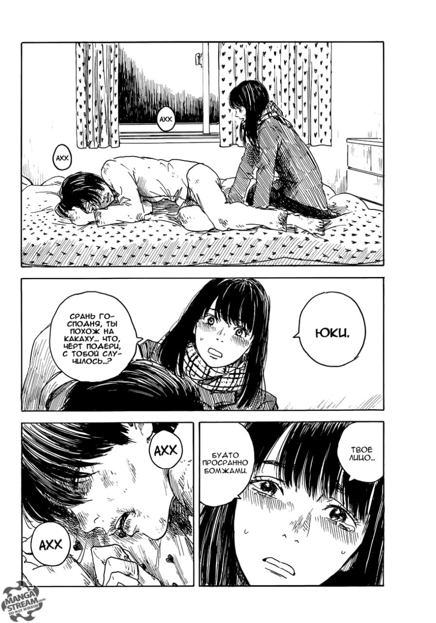 А вот Хино берет экзистенциальным хоррором. За простыми рисунками и диалогами кроется нечто большее - невыносимая тоска и одиночество. До сих пор вспоминаю его рассказ про мальчика без рук/ног, у которого мамка проститутка и как она спала с клиентами в доме, а потом умерла. ФК как всегда обосрались и потеряли последнюю страницу.