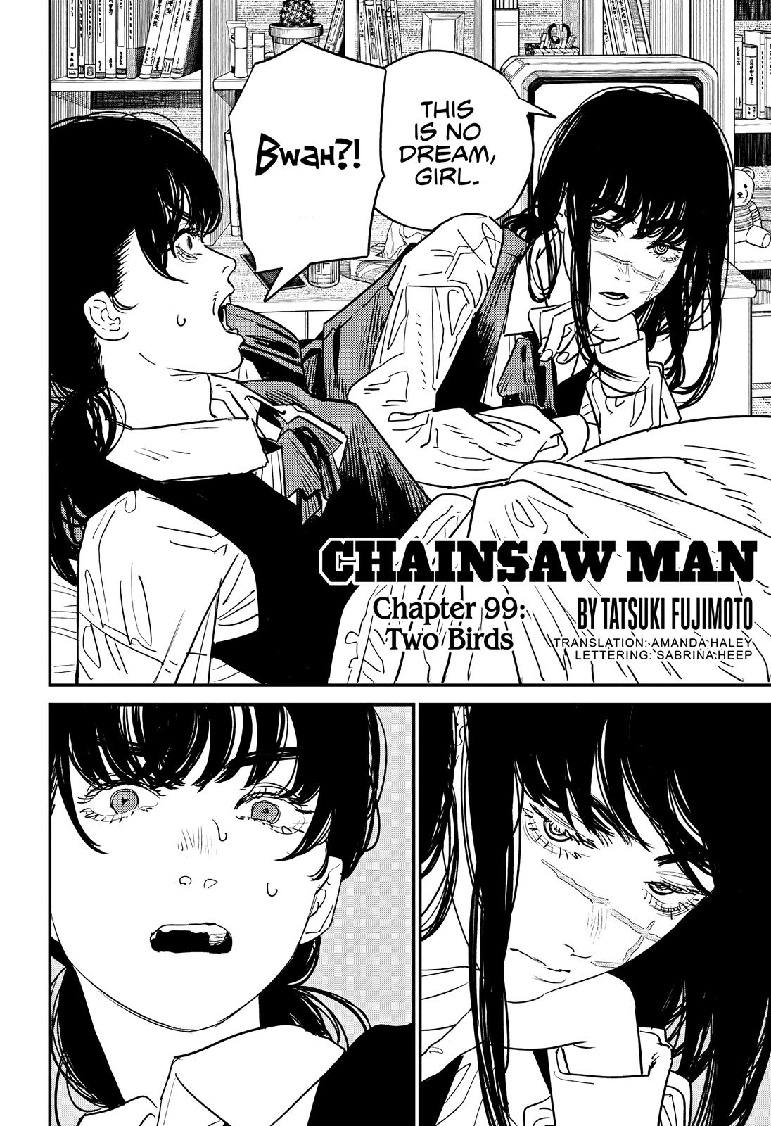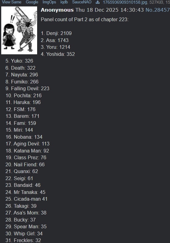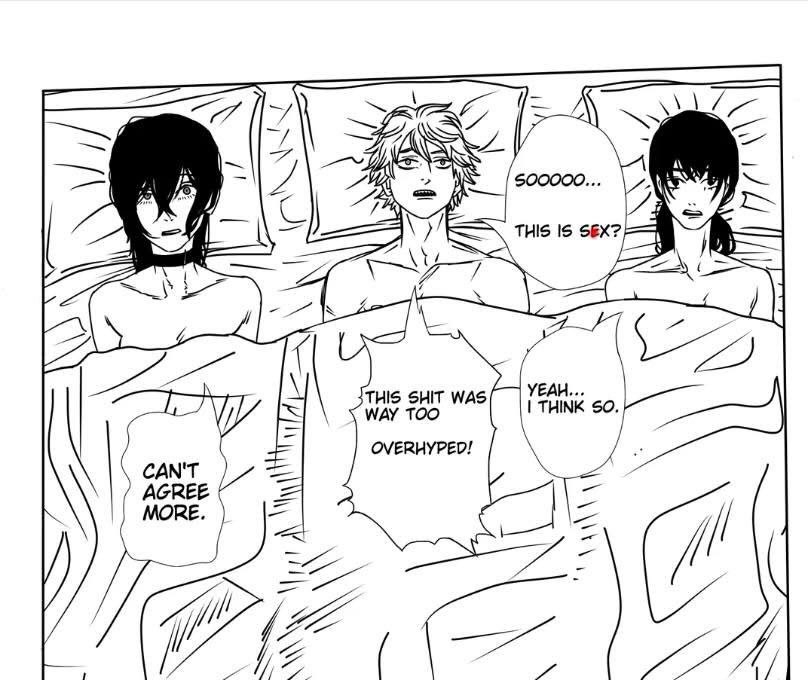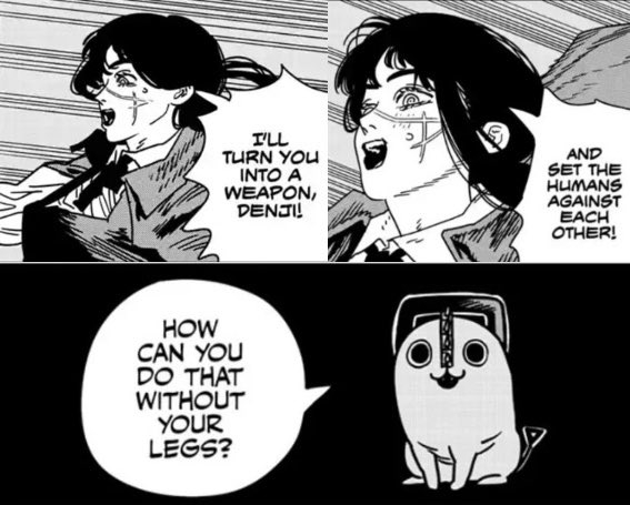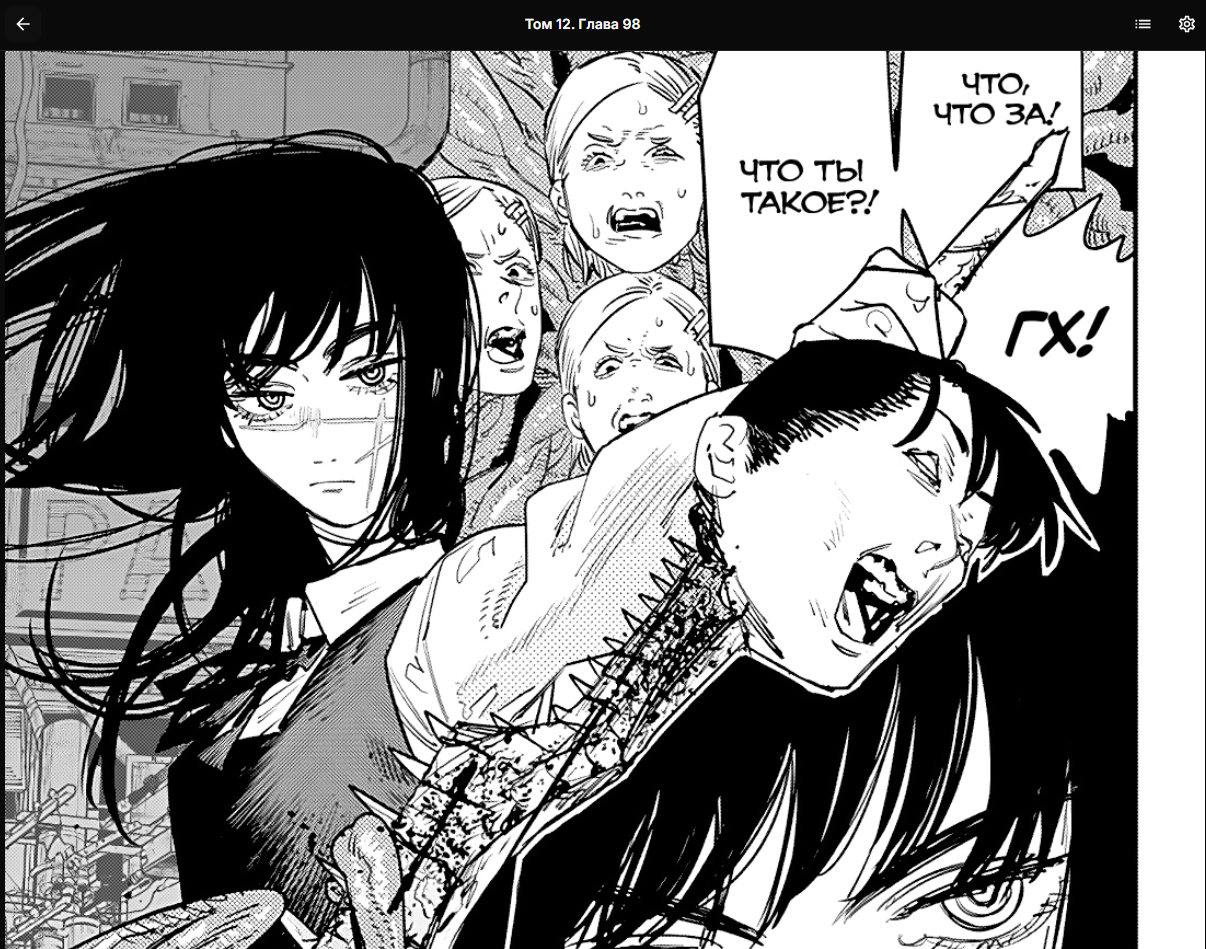 Буквально нет ничего, что бы Фудзимото сделал, и все бы охуели. Я вот охуел только один раз за всю вторую часть, это когда денчик с почитой разговаривает, а почита такой "а как ты будешь бежать, если у тебя ног нет", и следующим кадром денчика распиливают на запчасти. А так фудзимото своими клиффхэнгерами ебаными несбывающимися приучил читателя, что всё может и откатиться в следующей главе.