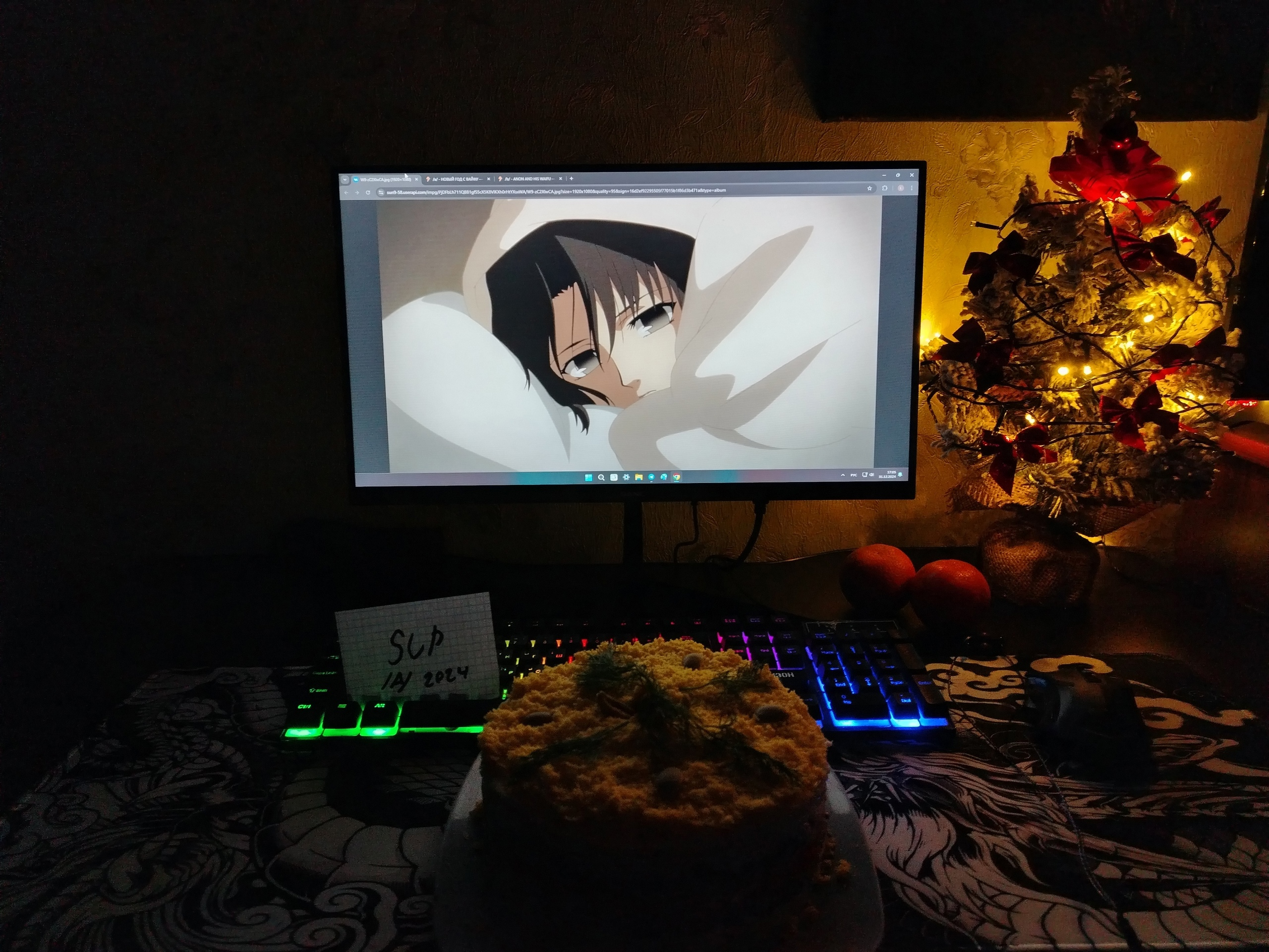 КАК ПОУЧАСТВОВАТЬ: 1. поместить в кадр свою вайфу в любой ее ипостаси — от картинки на мониторе до рукотворной статуи масштаба 1:1; 2. поместить в кадр Sup. Очень желательно, но можно без него; 3. запечатлеть, как ты вместе со своей вайфу празднуешь/готовишься праздновать предстоящий Новый год — примеры на пикрилах, но здесь все зависит от твоей фантазии, анон, четкого регламента нет. Можешь просто сфотать пикчу на мониторе и стакан чая, а можешь посадить дакимакуру рядом с мамкой за новогодний стол. Главное, поучаствуй и соблюди нехитрые правила; 4. запостить фотографию в тред на доске /a/, /vn/, /ma/ или /h/ до ~12:00 часов 01.01.2025 по МСК; 5. если небыдло и никак не отмечаешь данный жидопраздник, то обязательно, с сажей, уведомить об этом весь тред (но все равно за компанию сфотаться с няшей :3); 6. PROFIT!! Первого января опохмелившийся ОП выкатывает коллаж со всеми фотографиями а-ля прошлогоднего коллажа или пикрила от братушек с форчана.