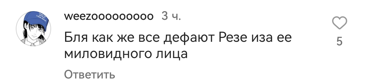 Резе конечно милая, кокетничает и всё такое. Но каменный стояк у меня только в моменты когда она ногами с дубовыми ляжками пиздит пилу, взрывает здания и "бумкает" толпы овощебезников.