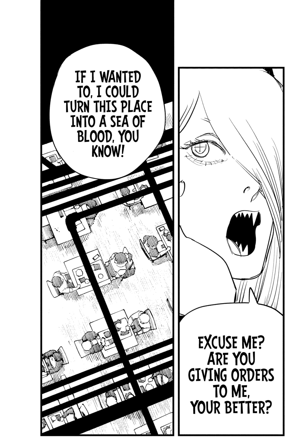 В конце новой главы очень вероятно и правда кровь в аду. Верхняя левая панель, Пава: Если бы я только захотела, я бы превратила это место в море крови, ясно вам?!