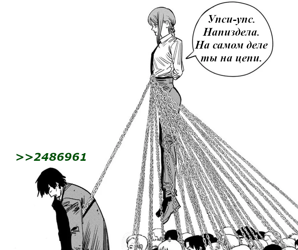 >>2486893 Ну ща я тя ещё раз унижу Тебе походу это очень нравится Посмотрим как ты рякнешь в этот раз Вот тебе последняя странице на которой появляется живая Наюта Что ты здесь видишь, а? Обычные гражданские, которые ебанулись от происходящего в городе и устроив охоту на ведьм убили своими собственными руками Наюту? Да, всë именно так Лишили жизни Наюту не работники общебеза, а простые нпс Хорошо, давай посмотрим на причинно-следственную связь и отмотаем немного назад Почему народ устроил охоту на ведьм? Потому что люди начали превращаться в псевдопил Из-за чего они начали становиться демонами? Потому что заключили контракт с демоном Огня Кто свел этих людишек с демоном огня? Да, это был Барем о чем он сам и говорит в манге Где они заключили контракты? В церкви. Она создана общебезом? Нет, её создал демон Смерти, а Барем и гибриды её подчинённые, которые исполняют её хотелки Таким образом получается, что демон Смерти стоит за смертью Наюты Своими действиями она намеренно создала ситуацию в которой демон Бензопилы стал сильнее из-за страха людей перед ним, а Наюту убили пострадавшие от происходящего люди, а не общебез В последствии её труп забрал работающий на Смерть Барем и отрубил голову для выведения Денджи из строя и вызволения Почиты наружу т.к это нужно для остановки предсказания Нострадамуса Общебез был в контрах с церковью и открыто вступил с ней в конфронтацию Слова Барема об одной цели не говорит об их сотрудничестве У действительно общая цель остановить конец света, но в манге они ведут войну друг с другом Таким образом тебе разжевано кто убил наюту и кто стоял за всем происходящим в арке Единственный момент кооперации общебеза и Барема был в недавней школьной арке, где он и Йошида вместе вызвали Почиты Давай фантазируй хедканоны, я жду