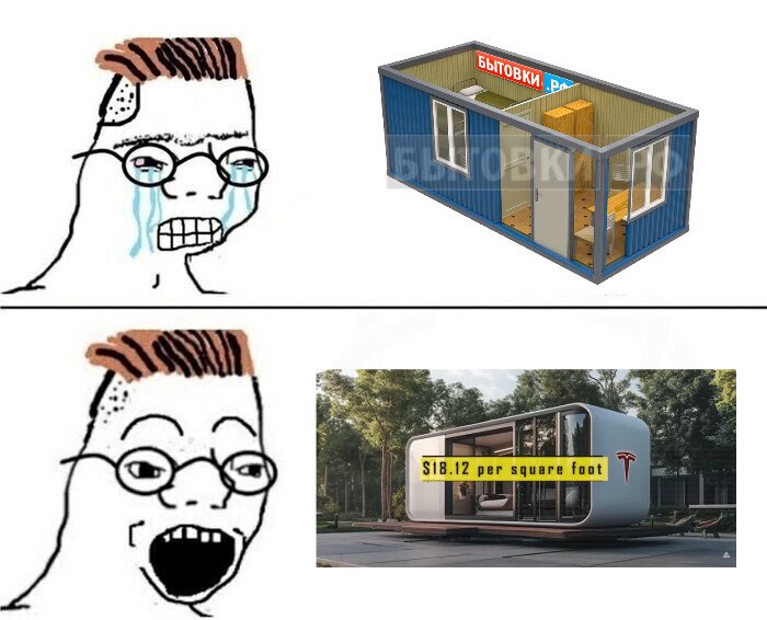 >>47173 Святой Машк Небоходец уже прдсуетился: — Мебель, сантехника, полная отделка, энергоэффективность — Холодильник, плита — Сборка 24 часа — Экологичность и безопасность — Несколько стилей от хай-тека до традиционного — Панель Солар-сити и Старлинк — 18 долл за кв фут (хрущ в мск 2300 долл за кв.м. у МКАДа на первом этаже, до метро на газели = 7 млн за 33 метра, бабушатник или после пожара) — Можно жить где угодно: в Сочи, лесах Карелии, у горного ручья на Алтае, в территории Москвы в любом садоводческом товариществе, например в Серебряном бору, на Марсе побережье Тихого океана бесплатного дальневосточного гектара и двачевать капчу, ловя лосося — до 35 квадратных метров, например стандартный однокомнатный советский хрущ 33 метра, где часто уживались семья с ребёнком + бабушка и дед что даже увековечено в известном сериале)