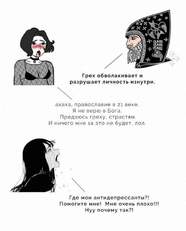 В этом и проблема всех религий, как я и писал выше. Зачем тебе пытаться разбираться в своём психологическом состояние, изучать свои реакции, поведение, работать над собой с помощью когнитивной психологии и доступных инструментов которое уже дала наука! ведь можно просто попросил сил у всевышнего? Это я считаю и есть слабость. Аналогично что страус с головой в песке. Меня выращивали в христианской семье и как следствие сломали психику, буквально с самого детства с самых пелёнок убедили меня что за мной следит какой-то мужик, он видит все мои действия и мысли. Представляешь последствия? Вырос добрый и слабый мальчик которое проебал всё что можно, думая лишь о моральной стороне любого своего действия. Теперь я понимаю, мне не нужен бог что бы быть добрым человеком. А мужика из головы уже не выкинуть, ощущение что за тобой следят какие-то ангелы хранители (которое даются при крещение + становление крестным отцом). Убежденность то что меня кто-то бережёт, все это замашки слабых людей. Если у меня будут дети, я научу его ходить по головам, в меру меркантильным и делать те вещи, которое сделают по настоящему счастливым. Научу разбирать в людях, объясню кому можно доверять, кому нет. Кого можно наебать, а кого не стоит. А не просто быть добреньким мальчиком. Быть плохим в нашем мире это нынче хорошее качество для выживания, если не хочешь как я большую часть жизни прожить в нищите молясь.