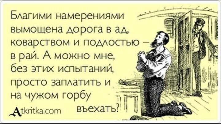 ты явно читаешь мои слова через призму обиды. Я как раз пишу про то, что молиться чему-то эфемерному БЕЗ ЛИЧНЫХ ДЕЙСТВИЙ это сумасшедствие. Именно связка молитва-поиск нового решения - новое действие для меня сработала. Я раньше без молитвы поступал только так, как велит мне мой Эгоизм. Наебать ближнего, выебать доступную девушку, распределить деньги так, что бы было выгодно мне. Все мои поступки были подчинены КОРЫСТИ. Один вопрос был в жизни - А ЧТО МНЕ С ЭТОГО БУДЕТ ?