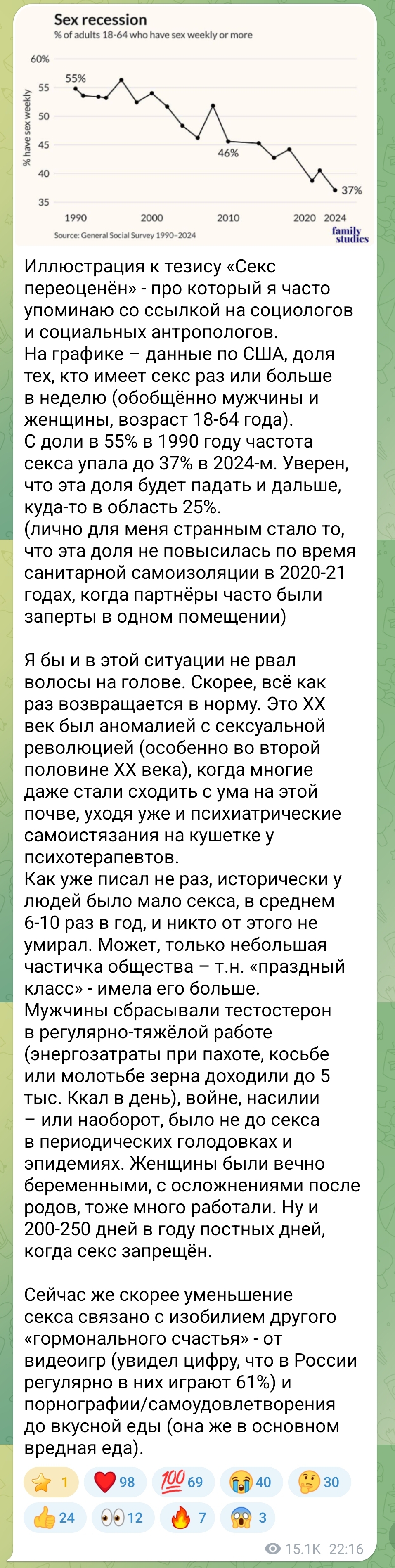>>53430 >Мы работаем вместе Мои соболезнования. Такой режим мало кто способен вынести, обычно это браки по расчету. У тебя, очевидно, не тот случай, ты уже сейчас перегораешь. >мне постоянно пишут и еще обижаются потом, если не отвечаю Прямым текстом поясняй, что у людей должно быть личное пространство и время, даже у женатых. Особенно у женатых, т.к. в нормальном браке у тебя так и так мысли крутятся вокруг бытовухи 24-7. >Вы какие-то тестостероновые монстры раз у вас хватает на все сил? Нет, просто научились личные границы выставлять. В этом нет ни грубости, ни черствости - это абсолютно естественное и необходимое поведение. Когда влюблён в тяночку, думаешь, что жизни не хватит, чтобы налюбоваться её выкрутасами. Но по факту всё проходит очень быстро - влюблённость выветривается и приходит осознание, что помимо секса в твоей и её жизни ещё 9000 бытовых нюансов.
