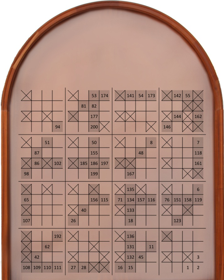 1. Вычленяем все простые числа до треугольника и складываем. И того у нас $5+5+13+19+3+3+2+5+7+3+5+19+2+2+5+5+3+29 = 135$ 2. Вычленяем все квадраты до треугольника и тоже складываем. И того у нас $9+4+9+9+9+9+9+9+9+9+9+9+16+9 = 128$ 3. Складываем два результата $128+135 = 263$ 4. Делим на кол-во строчек до треугольника $263 / 9 = 29.(2)$ 5. Делим на кол-во столбцов до треугольника $263 / 11 = 23.(90)$ 6. Перемножаем целые части обоих получившихся чисел $29 \cdot 23 = 667$ 7. Отнимаем встречавшееся здесь число, при этом обладающее уникальным свойством - оно и не простое, и не составное, т.е. число $1$. И того у нас $667-1 = 666$