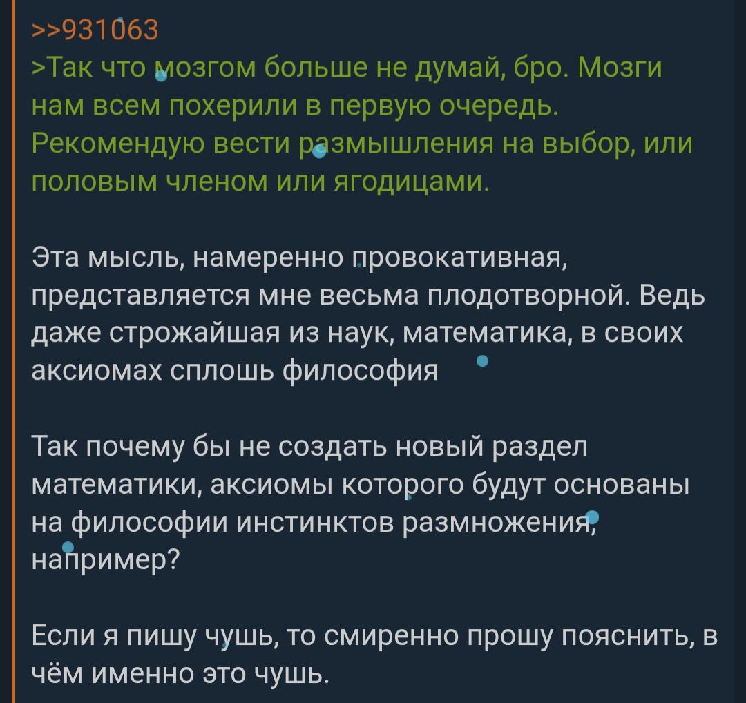 Вы совсем ебанулись вестись на толстый (как целлюлитная жопа его мамаши шлюхи) щитпост конструшка? Какое нахуй вербальное поведение, вы понимаете что сводите математику к биологии или того хуже к психологии?