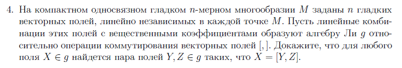 Сап, двач помоги решить задачу по гладким многообразиям. Я пока рассуждал так. Допустим, L!=[L,L]. Тогда существует базисный вектор e такой, что он не равен коммутатору. Тогда можно получить, что его дуальная форма w имеет нулевой дифференциал, т.е. dw = 0. Препод задал встречный вопрос, является ли форма точной, т.е. существует ли функция f: w = df