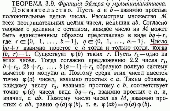 >>78684 тоже не догоняю, хуйня какая-то, факт из ТЕОРЕМЫ(пиздец) проще доказать либо через табличку m на n, а лучше - через изоморфизм из КТО(ну типа надо показать что образ группы обратимых по умножению в Z/mnZ - это в точности группа обратимых по умножению в Z/mZ x Z/nZ, а порядок последней легко посчитать)