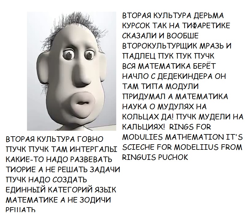 >>52383 >же здесь один такой юродивый В том смысле, что опустился до разговора с тобой, что ли? И не с такими дебилами сталкивался. >подвести группоид под какие-нибудь преобразования едва ли должно быть Угу, можешь подавать заявку на грант уже, напишешь учебник по алгебре с позиций Арнольда, упразднив аксиомы группы и кольца окончательно. Безусловно, твой высер разделит судьбу двухтомника Ван дер Вардена и со временем я стану горд тем что имел честь общаться с тобой, тупым клоуном, на анонимной имиджборде. Ещё есть что сказать, или это всё?