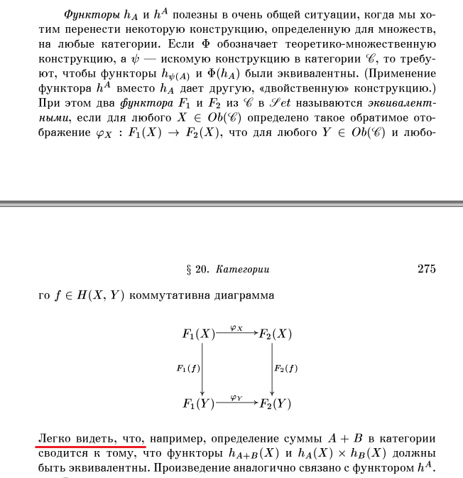 >>124476 Ты про это (пик 1)? Ну не знаю мне как то нихуя не легко видеть. Мне кажется у меня утверждение гораздо проще сформулировано чем эквивалентность функторов. Может дело привычки. >Это всё очевидно Это забавно потому что первой моей мыслью было когда я понял (или где то увидел, не помню) этот факт - этого не может быть потому что если бы это было так об этом обязательно бы было везде написано. Математика вообще состоит из очевидных вещей (пик 2) и ничего. >об этом все знают Что прям из пизды и выпрыгивают со всеми знаниями? >поэтому и не говорят каждую секунду. Ну каждую секунду говорить необязательно. Можно просто один раз написать одно замечание сразу после определения.
