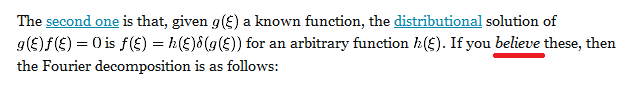 >Еще раз >используется в каждом первом учебнике физики. ну замечательно же; надо думать, в этом месте для тебя всё наконец понятно. я тебя поздравляю, если это действительно так (я тебе не верю, но не суть). потому что в твоём исходном уравнении и в том методе его решения, который так ударился тебе в сердечко, ничего сверх этого по существу и нет. немного больше арифметики с использованием дополнительных свойств преобразования Фурье, но на этом всё: внутри фреймворка, в рамках которого оно применяется и приводит к решению, обоснование то же самое. если тебе всё понятно с ним, то и с исходным вычислением должно быть понятно