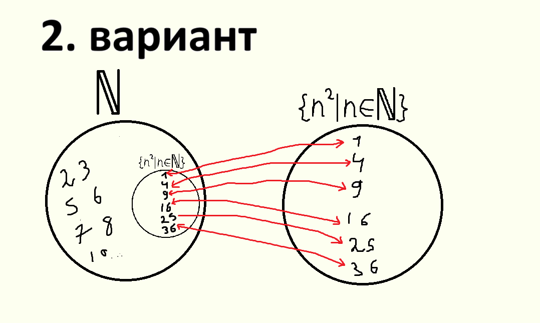 А множества всех квадратов и всех прямоугольников равномощны? Интуитивно хочется сказать, что нет, ведь содержание понятия "квадрат" больше, чем понятия "прямоугольник", а, по правилу из формальной логики для гуманитариев, объём понятия обратно пропорционален содержанию: у "кв" он меньше чем у "п-ка". Но мощность множества это другое