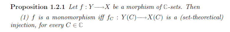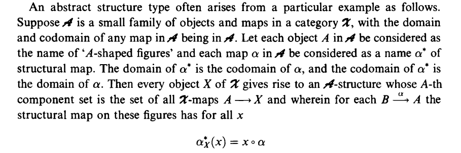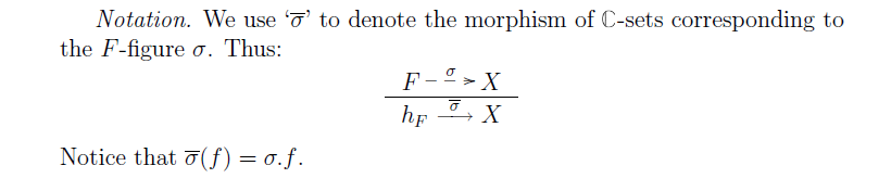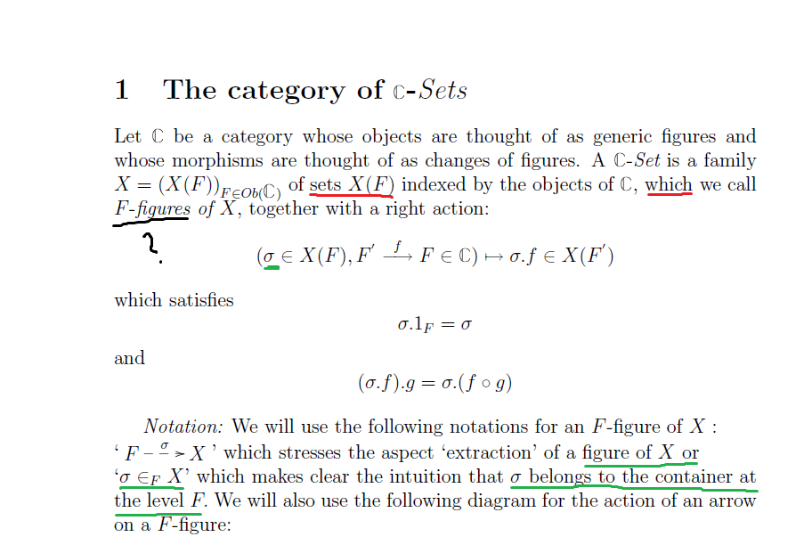 >>124555 обозначения понять трудно, но можно 1. имеется категория $\mathbb C$, объекты которой названы "фигурами" и обозначаются через $F$. 2. каждой фигуре $F$ сопоставляется множество $X(F)$ (я бы обозначил его через $X_F$, но здесь так). множество $X(F)$ названо "F-фигурой". набор множеств $\{X(F)\}_{F \in \mathcal C}$ обозначен через $X$ 3. для каждого морфизма $F \to F'$ задано отображение $X(F) \to X(F')$, которое названо "правым действием" и удовлетворяет некоторым свойствам; свойства записаны для произвольного элемента $\sigma$ множества $X(F)$ 4. далее вместо $\sigma \in X(F)$ автор хочет писать $F \dashrightarrow^\sigma X$ (расположить $\sigma$ над пунктирной стрелкой мне уже не удаётся) 5. кроме того, вместо $\sigma \in X(F)$ автор также хочет писать $\sigma \in_F X$ 6. автор хочет называть множество $X(F)$ "контейнером на уровне $F$"