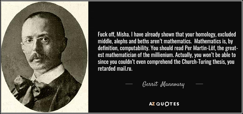 Что-то пиздел про топосы, пока дауну не объяснили, что это такое. Потом пиздел про тезис Чёрча, не зная что это и о чём он. И так со всем. Составление бессмысленных текстов из криво склееных кусков чужих фраз, в попытке изобразить какое-то понимание. Я даже не буду вспоминать, сколько раз ты обосрался с использованием философских терминов, доска не об этом. Понимание математики даже на школьном уровне у тебя тоже отсутствует, ладно, специалистам по аниме это не надо. Но мог хотя бы по своему интуиционизму почитать что-то кроме википедии? Отовсюду же лезет твоё незнание.