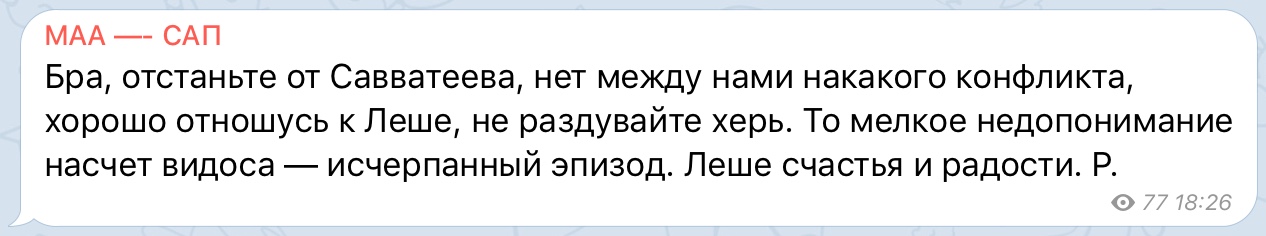 Передайте ВСЕМ, что я больше с Мишей Прохоровичем не имею общих дел, и с настоящими, а не прикидывающимися волонтёрами перемещаюсь на новый канал ``Маткульт - привет!''!