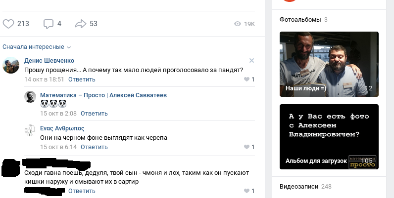 >>48797 ROMA MikhailovГод назад Мы договаривались с А. Савватеевым, что запись этой лекции не появится в интернете. А она появилась. Вы не могли бы ее убрать? В этой лекции много личного и она читалась с расчетом на то, что ее не будет в публичном доступе. Ответить Скрыть ответы alexanderfilatov alexanderfilatovГод назад Добрый день! Леша мне ничего такого не говорил и передал все записи для опубликования. Очень жаль. Собственно весь проект МАСЭП, в т.ч. ориентирован на распространение знаний и интересных материалов, а не на их сокрытие. Хотя, конечно, автор имеет право. Компромиссный вариант с доступом по ссылке для участников Школы тоже невозможен? Читать дальше Ответить ROMA Mikhailov ROMA MikhailovГод назад Да, давайте устроим компромиссный вариант, с доступом для участников но без общего открытого доступа. Ответить alexanderfilatov alexanderfilatovГод назад Да, я сейчас так и сделал - с доступом по ссылке и невозможностью найти по поиску. Спасибо большое! И за интереснейшее выступление тоже! Ответить ROMA Mikhailov ROMA MikhailovГод назад удалите, пожалуйста, это видео, его уже постят повсюду Ответить Виталик Стриж Виталик Стриж6 месяцев назад Роман Валерьевич, я позволю себе вмешаться и со своей стороны скажу, что в определенном смысле Ваш опыт пребывания в сектах и проч. — это повод для молодежи к вдумчивому анализу собственного мировоззрения. Мне, например, очень важно иметь в качестве собеседника такого человека, который: а) умеет говорить на языке субкультур (в том числе "кислотных", разбирающихся в "инфернальной метафизике"), б) обладает опытом некоей, если хотите, парадигмальной борьбы с деструктивными канонами археомодерна. С другой стороны, т.к. я человек гуманитарной среды, то для меня было бы большой честью и невероятным удовольствием соприкоснуться с носителем математической культуры, пробуя найти точки взаимного интереса, различные центры консолидации (быть может, обращаясь к философскому осмыслению тех же онтологических оснований математики, ведь вечные вопросы никто не отменял). С уважением, Виталий (17 лет). Читать дальше Ответить Artur Landau Artur Landau2 месяца назад @ROMA Mikhailov Роман вас похоже наебали,если уж простым языком изъясняться,увижу Савватеева дам ляпоса,за этот научпоп. Ответить 2