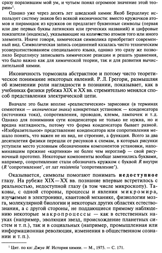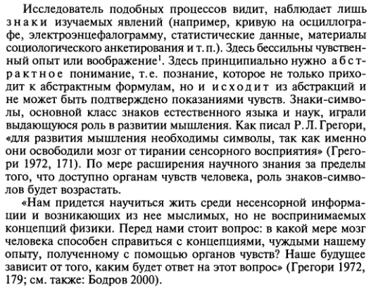 Исследователь подобных процессов видит, наблюдает лишь знаки изучаемых явлений (например, кривую на осциллогра- фе, электроэнцефалограмму, статистические данные, материалы социологического анкетирования и т. п.). Здесь бессильны чувствен- ный опыт или воображение1. Здесь принципиально нужно абст- рактное понимание, т.е. познание, которое не только прихо- дит к абстрактным формулам, но и исходит из абстракций и не может быть подтверждено показаниями чувств. Знаки-симво- лы, основной класс знаков естественного языка и наук, играли выдающуюся роль в развитии мышления. Как писал Р. Л. Грегори, «для развития мышления необходимы символы, так как именно они освободили мозг от тирании сенсорного восприятия» (Грего- ри 1972, 171). По мере расширения научного знания за пределы того, что доступно органам чувств человека, роль знаков-симво- лов будет возрастать. «Нам придется научиться жить среди несенсорной информа- ции и возникающих из нее мыслимых, но не воспринимаемых концепций физики. Перед нами стоит вопрос: в какой мере мозг человека способен справиться с концепциями, чуждыми нашему опыту, полученному с помощью органов чувств? Наше будущее зависит от того, каким будет ответ на этот вопрос» (Грегори 1972, 179; см. также: Бодров 2000).