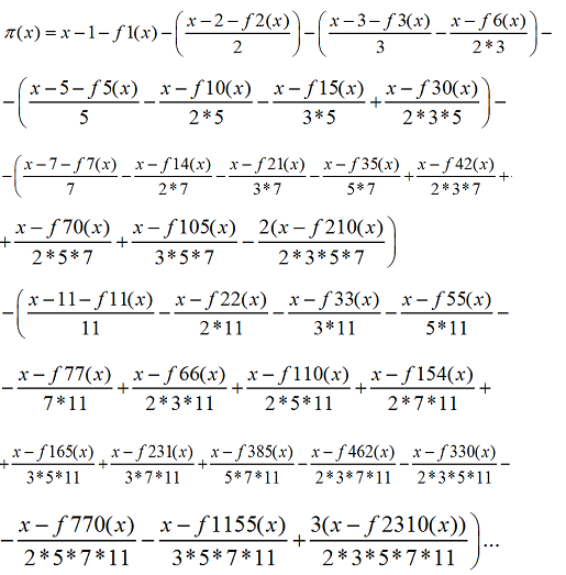 Эта формула исключает из данного числа x все не простые числа, по правилам решета Эратосфена. Решето Эретосфена это метод, придуманный Эратосфеном Киренским для определения последовательности простых чисел. Алгоритм таков, если взять ряд из натуральных чисел без единицы: 2 3 4 5 6 7 8 9 10 11 12 13 14 15 16 17 18… и исключить из него все четные числа, кроме самой маленькой из них, т.е. двойки, получится: 2 3 5 7 9 11 13 15 17… А потом из этой получившейся последовательности исключить все числа которые делятся на следующее простое число после двойки, это число 3, не считая ее самой. Получится: 2 3 5 7 11 13 17… Если так делать до бесконечности, то останутся только простые числа. Моя формула работает по такому принципу. Сначала формула исключает единицу из данного числа x, а потом количество всех четных чисел, кроме 2. Далее количество чисел, которые делятся на 3, кроме тройки, а из данного количества исключаются четные числа, которые которые делятся на 3 и т.д. fn(x) обозначает самое минимальное число, которое надо исключить из x, чтобы получилось то число которое делится на n без остатка.