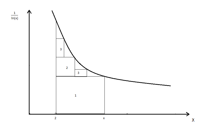 Верхний правый угол всех прямоугольников лежат на определенной точке графика, а так как прямоугольников бесконечно много, то углы прямоугольников охватывают все точки графика от 1/ln(2) до 1/ln(x).