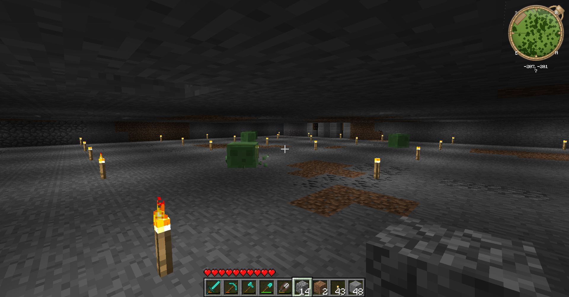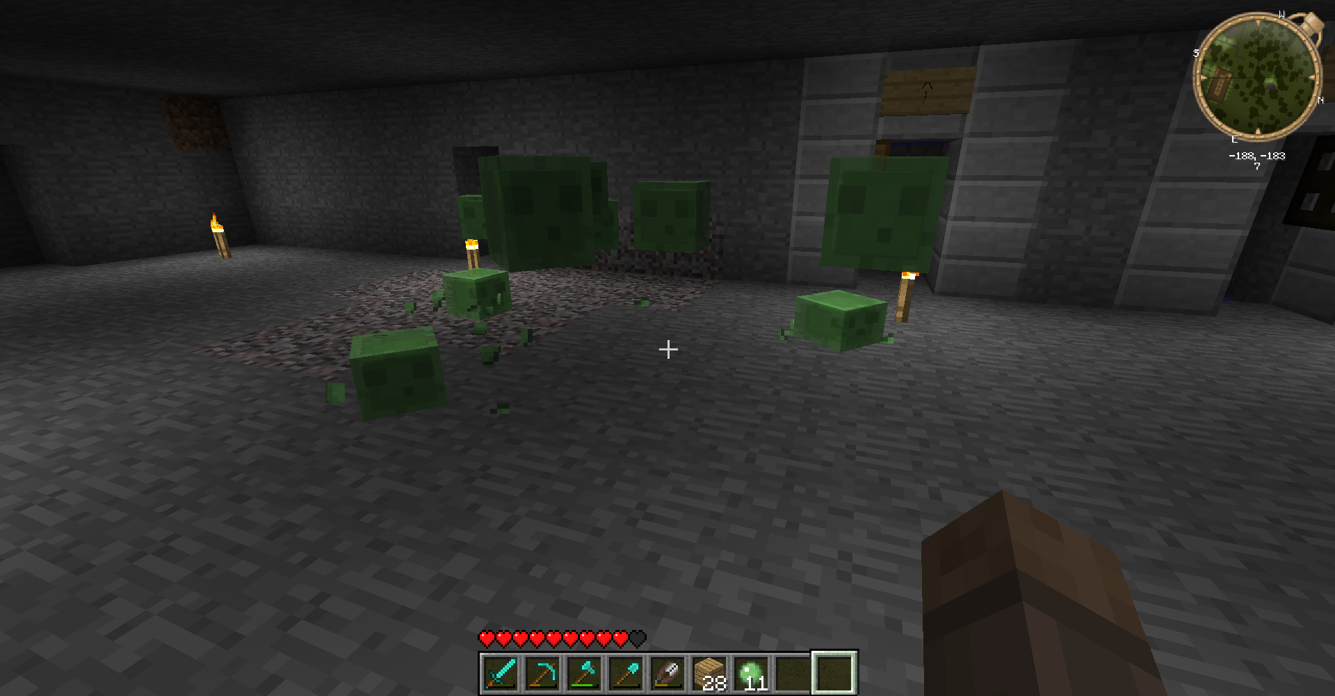 Вырыл огромное пространство у коренной породы под ферму слаймов. Поставил факелы, и результат не заставил себя долго ждать. Буквально спустя 10 минут появились первые слизни. Убил одного из них алмазным мечом и понял, что так их рубить нельзя, ибо в таком случае не выпадает заветная слизь, которая мне нужна для липких поршней.