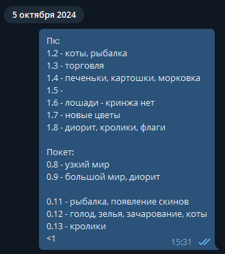 Есть проблема. Не могу сидеть в 1 мире, есть другие на разных версиях , модах. Переключатся между ними изматывает, всё не запомнишь. Но и в 1 тупить очевидно идиотизм когда есть другие тоже ждущие чтоб поиграл с уникальным контентом. В итоге разрываюсь меж мирами и порой в итоге вообще ни в один не играю. И везде слабо развит конечно ибо не успеваю столько миров. Это тоже влияет на негативное впечатление. А все из за того что Майнкрафт бесконечен. 1 мир можно выдрачивать хоть сколько так и не попробовав остальные сборки а это уже тоже грустно. Такая вот серьезная проблема. Как играете то? Как лошки забрасываете миры переходя на следующий что ли