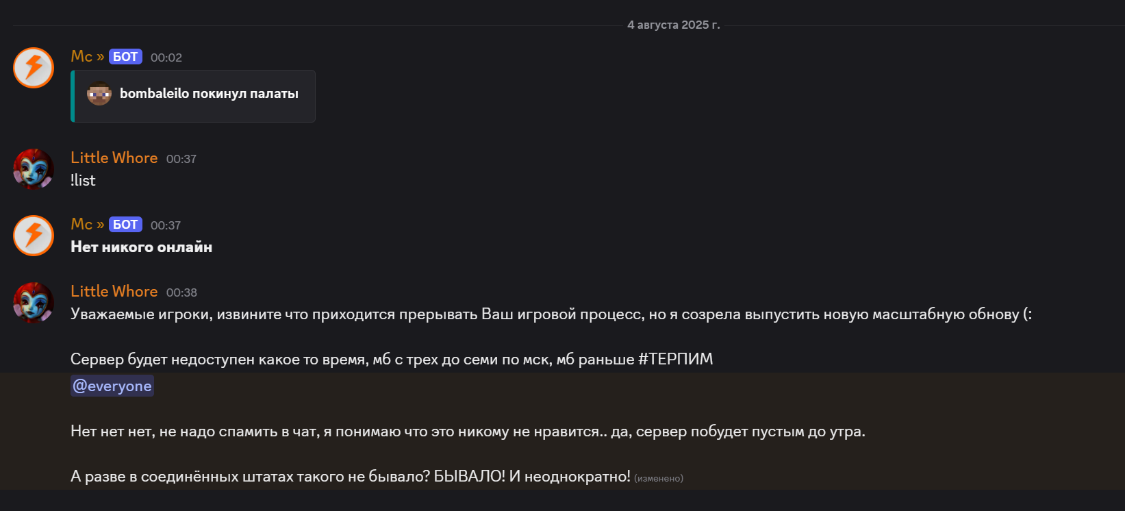 Написала плагин, который пишет координаты в личку если игрок сдох ( по команде /dh можно посмотреть последние 10 смертей с подробным лог выводом ), Пофикшен баг, из за которого фейерверки наносили урон при подключении, Для пропуска ночи теперь достаточно 30% игроков, Исправлены /msg и прочие сообщения в чате, Исправлены все пермишенсы для дефолтной группы, Реализован плагин на письма афк игрокам ( команда /mail, прочесть при входе /mailinbox ), Поправлено отображение достижений в чате игры, Настроена и протестирована антибот система, Новые игроки при первом входе получают мут на 120 секунд, ( это связано с медленными атаками ботов, которые подключаясь через какое то время начинают спамить в чат пакетами ) Написан с нуля плагин на кастомные картины, аналог imagemaps, подробнее здесь: #свои-картины ( https://discord.gg/yRs2qGPAu7 ) , Прочие мелкие правки, ( которых, к слову, очень много. начиная от интеграции дискорда и заканчивая менюшкой на /menu, кулдауна для команд, сообщениями о смертях, табом и т.д )