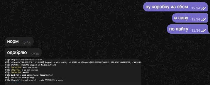 Чтобы зайти на сервер, нужно написать свой ник боту в телеграме: @kirieshka123_bot