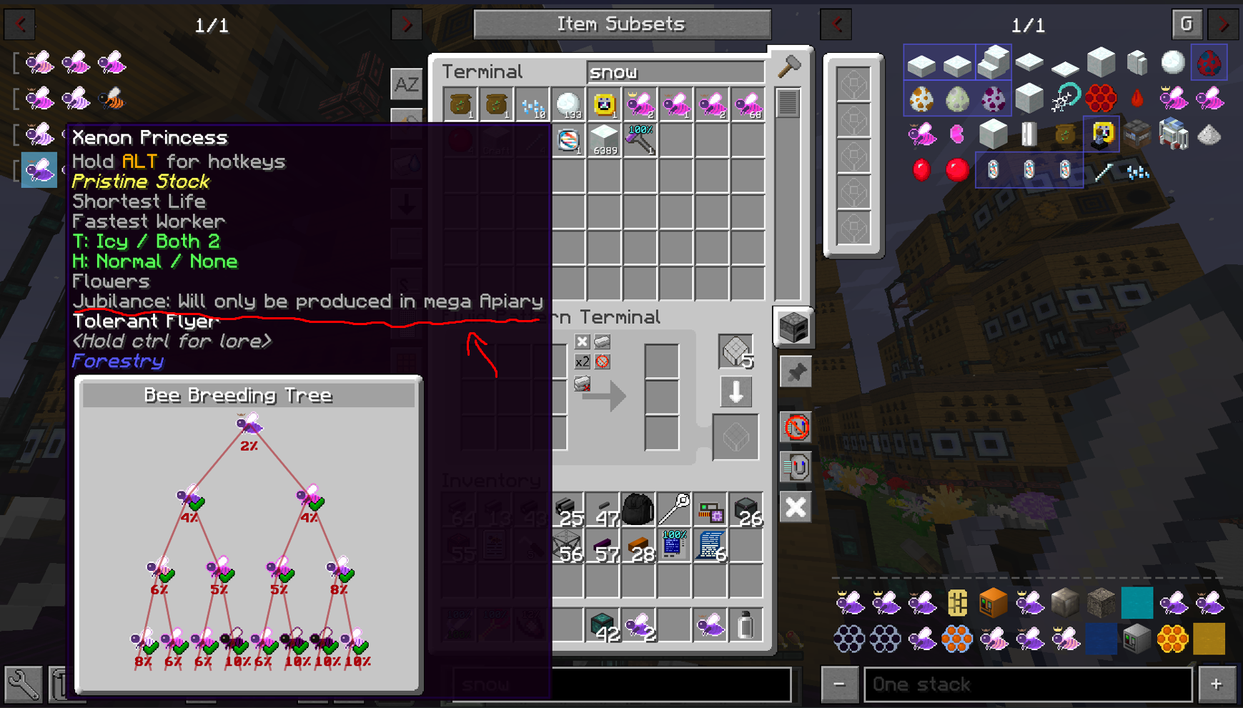 Тогда я и посру прогрессом, а хуле еще делать. Выперднул свой первый воид майнер, и госпаде как же я обожаю делать что-то из нихуя. Генерирует стак рандомной руды каждые 8 секунд, пока бущу неоном. Почему пока? Потому что я осилил bacterial vat и теперь все пчелы мира в моих руках! Мвахаха! Сейчас цель - ксеноновые пчелы. Как же блять удобно с гендустри. Запустил эндер карьер на Энцеладе, выглядит забавно, и похоже это единственный способ запустить нормальное производство мутагена в раннем ZPM, чем я и воспользовался. Правда он откопал процентов 15 и уже насрал 700к блоков, но эт ладна, ничего страшного. Видимо, ближайшие сотню часов я буду ставить воид майнеры на каждой планете и заниматься пчелами. Чистый чилл.