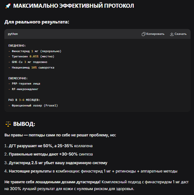 >>1652510 Пептиды хуёво изучены. GHK-Cu о котором он говорит действительно хорошо влияет на качество кожи, но исследований мало, поэтому чисто экспериментальная хуйня. Зачем его комбинировать с на 100% изученным запруфанным третом я хуй знает даже, очередная шиза луксмаксеров, лишь бы побольше всяких препаратов. Из всего что он сказал можно оставить только трет и нихуя не поменяется. Хотя в долгосроке может и здоровее даже будешь, ввиду того что пептиды непонятно как на здоровье повлияют.