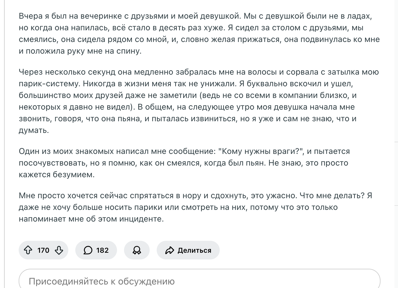 Как поживает анон который ходил с париком и хотел к себе девушку пригласить ? Помню многие писали , что какой будет стыд , если во время секса парик спадет .