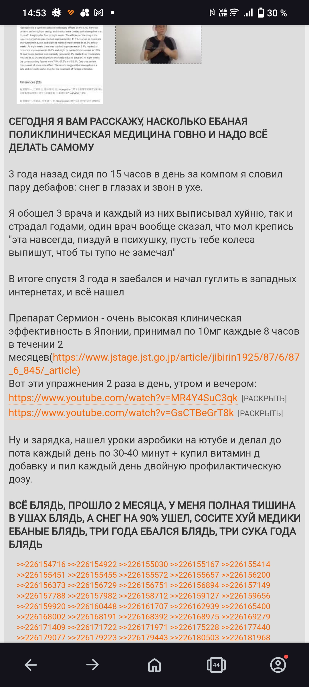 > Есть такое. В целом интересно читать предположения анонов. Может, даже с кем-то заообщаться получится... Товарищи по несчастью... В ТГ и ВК кстати есть группа по тинитусу, но не рекомендую читать. Там супер паникеры пожилые сидят, почитаешь и жить не хочется