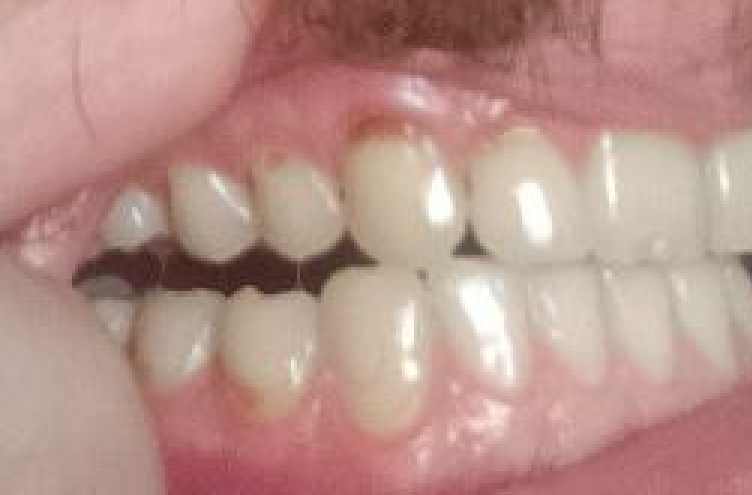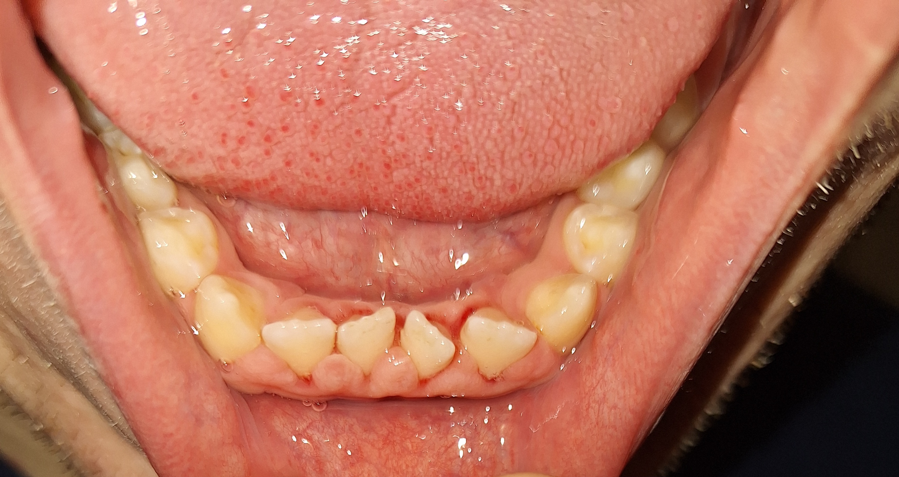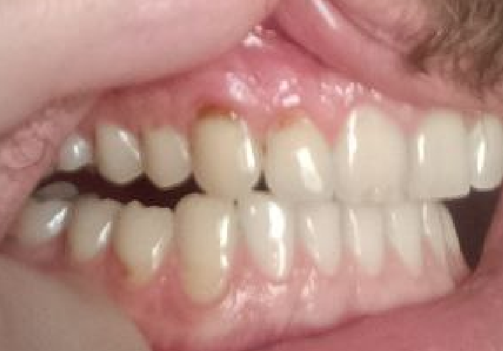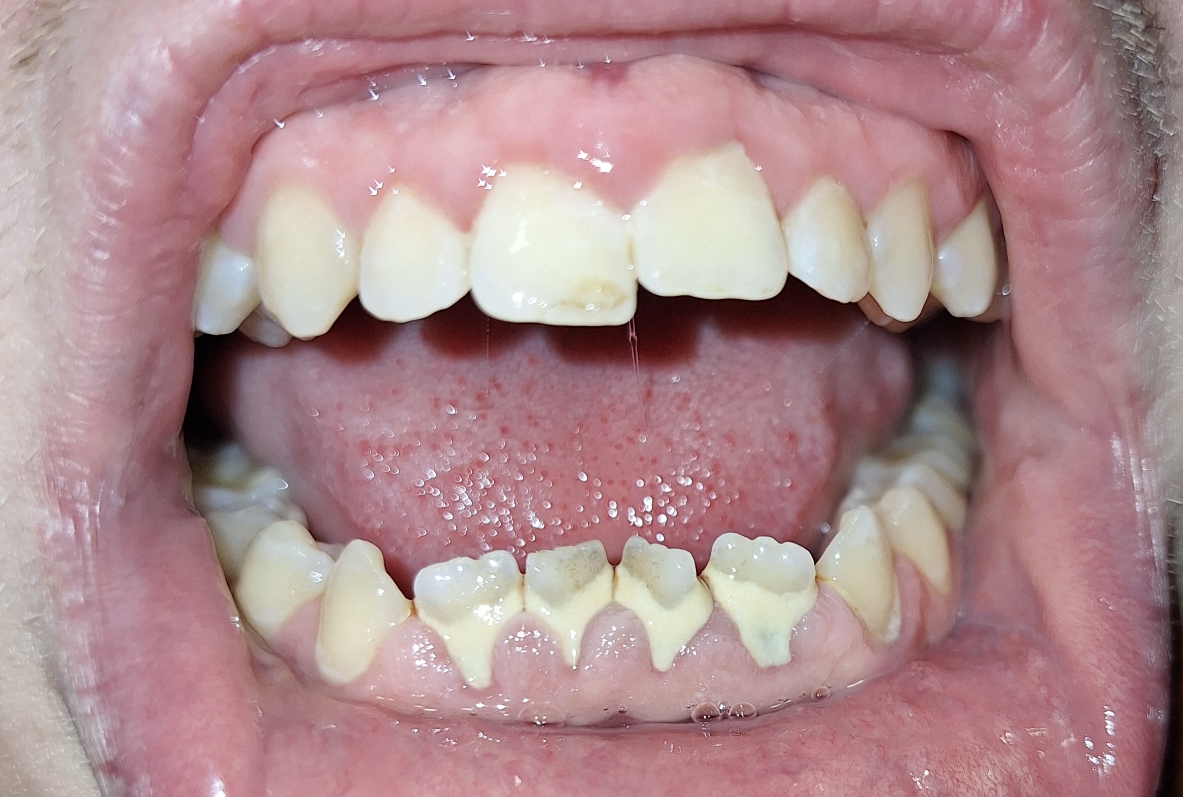 Сап медач. Опустились дёсны в нескольких местах, обнажились шейки зубов. Чувствительные, болят от прикосновений, могут реагировать на холодное, горячее, сладкое.