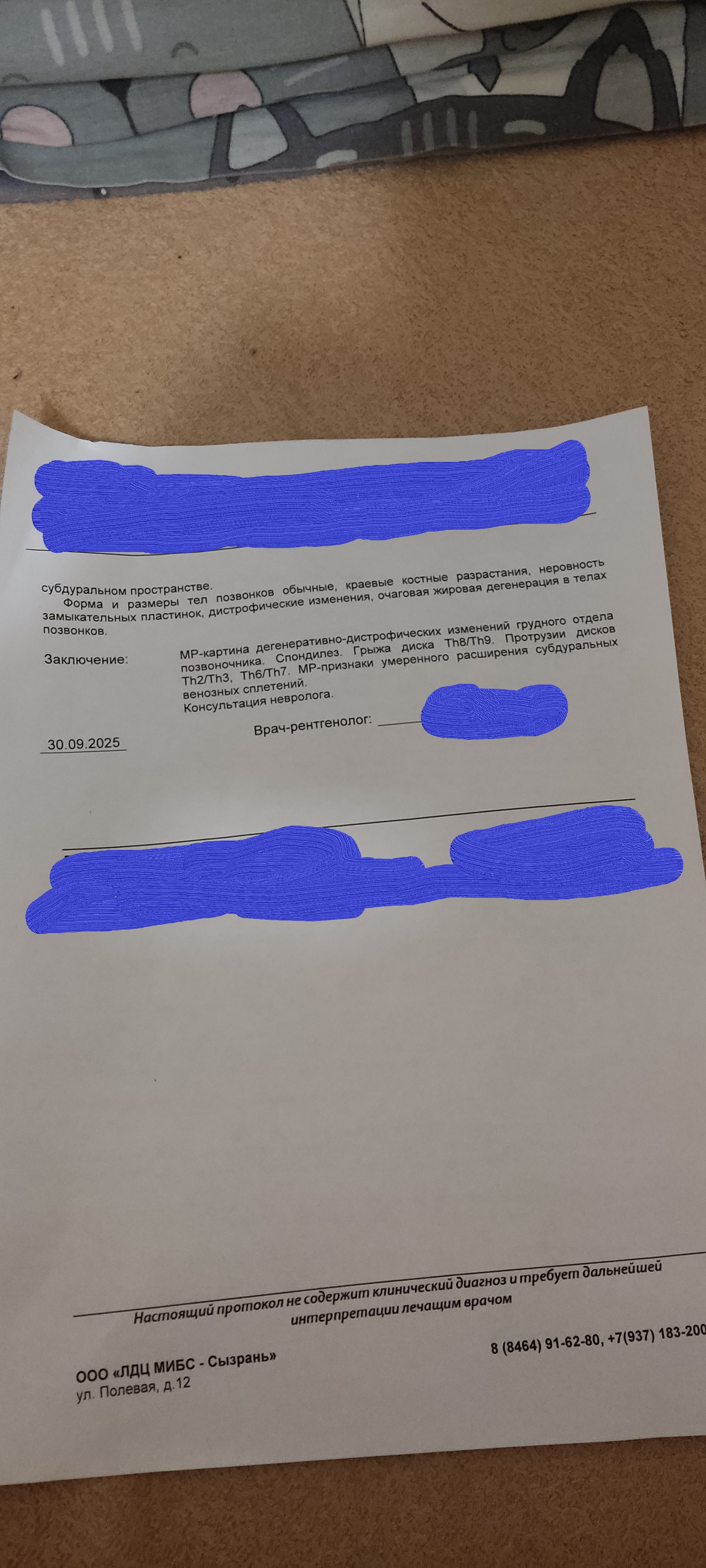 Заключение: Дистрофические изменения грудного отдела позвоночника. Протрузии дисков Th6-Th9. Спондилез. Спондилоартроз.