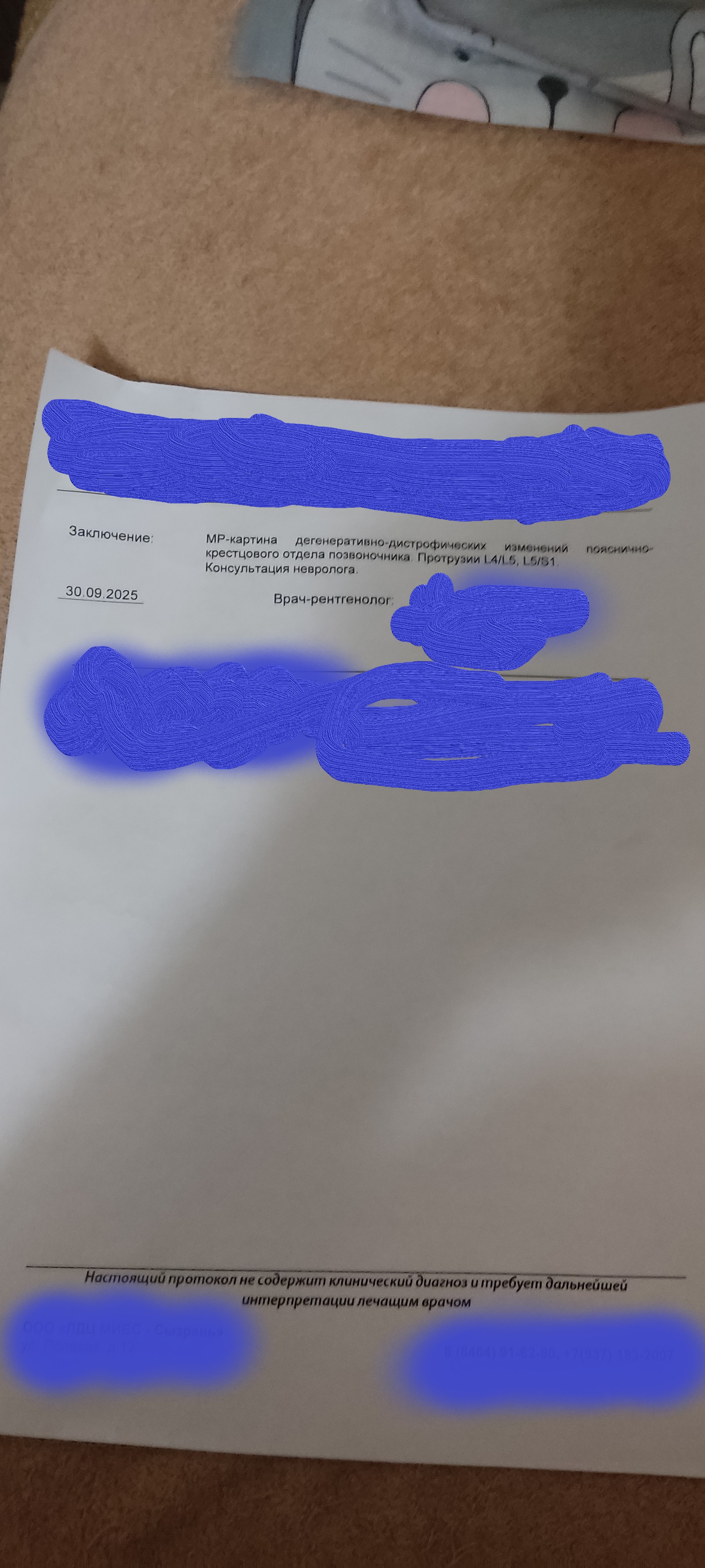 Заключение: МР картина дегенеративно-дистрофических изменений пояснично- крестцового отдела позвоночника. Протрузия диска L5/S1. Спондилоартроз.медиальная по типу протрузии диска L5/S1, размером 0,45 см, с сужением межпозвонковых отверстий.