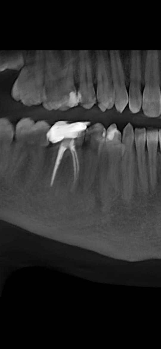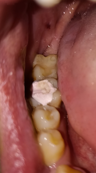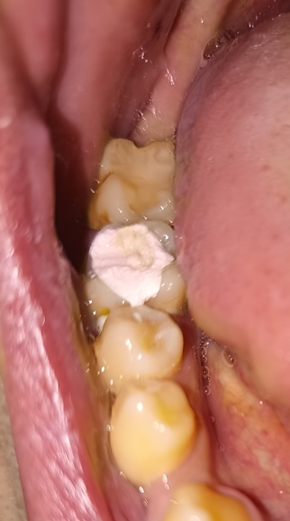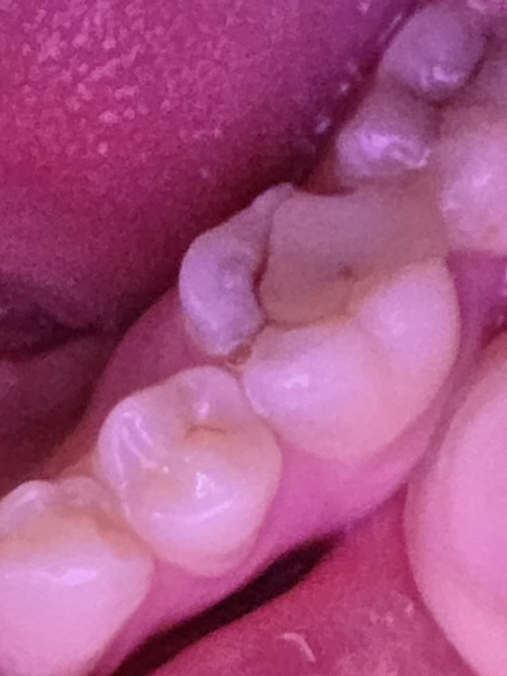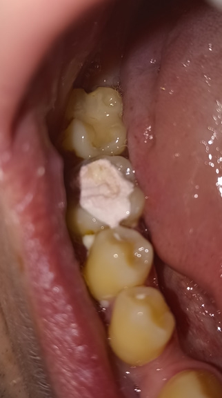 Сегодня ходил лечить пульпит, шестерку нижнюю, почистили каналы и поставили временную пломбу. Пломбу не фоткал как она была до. Было ощущение что при закрытии рта верхние зубы чуть-чуть опирались на зуб с пломбой, понял это уже только когда ебало от наркоза медленно начало отходить. Через четыре часа поел чуть теплого супчика с мягчайшими тефтельками, это был первый прием пищи после пломбирования, и понял что почему то верхние зубы снизу опоры больше не ощущают. Как будто часть пломбы отвалилась. Фотки прикрепляю.
