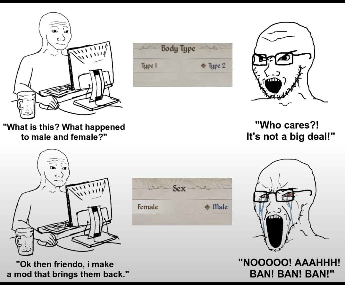 Притом что еще в елде если выбрать женское тело к тебе обращаются как к бабе, называют подружкой и т.п. И я не думаю что это особенности русской локализации. Зачем там сделали тело 1 и тело 2 тогда вдвойне непонятно. Но с другой стороны там не сделать красивую бабы, все получаются какие-то ебучие еврейки костлявые или накачанные без сисек и жопы