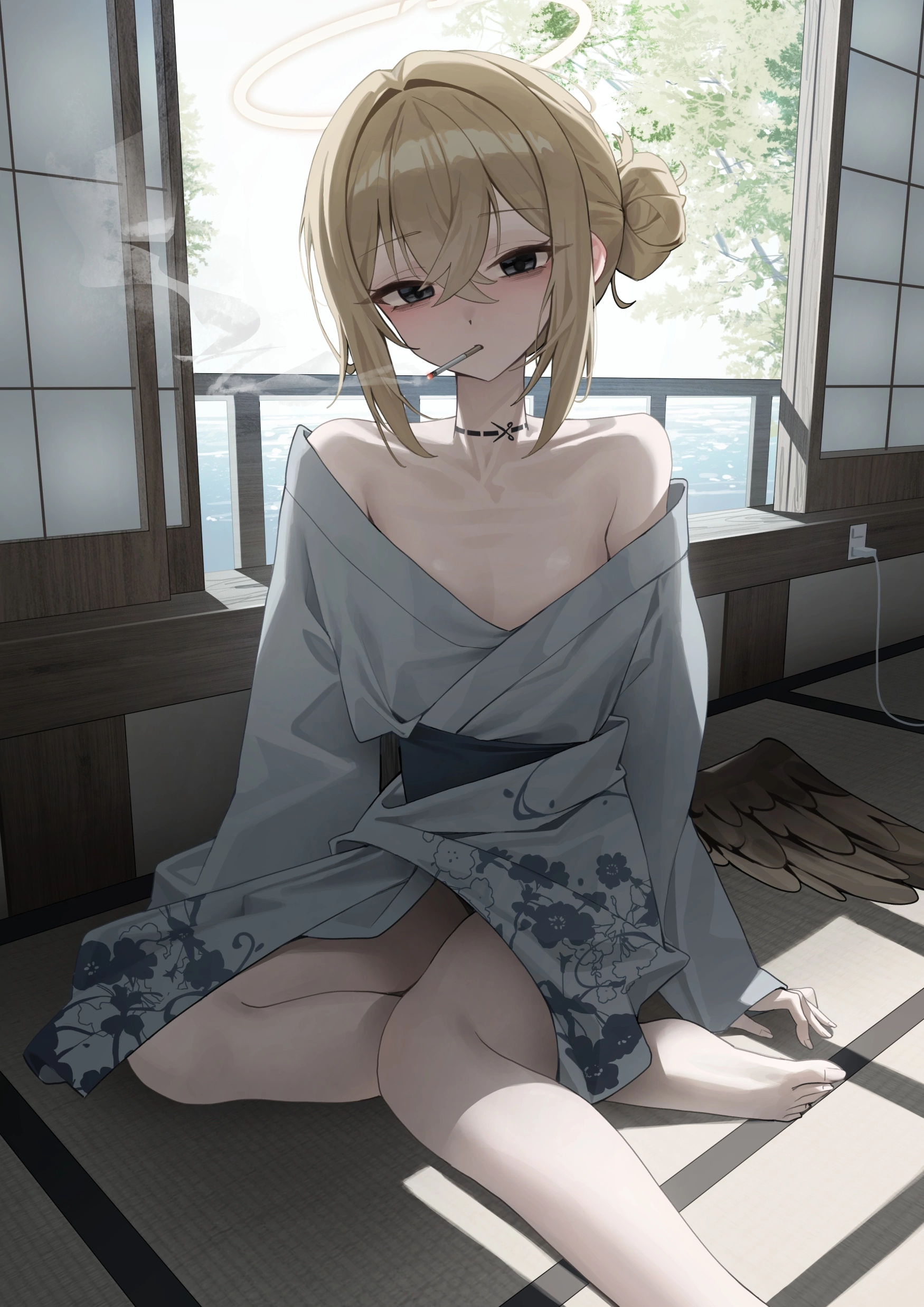 Я понимаю, что вам надо было изобразить больную девочку, и босиком и в ночнушке это общепринятый японский образ, но почему она где-то в ебенях играется, потом с грязными ногами и в соке от травы будет дальше на кровати болеть?
