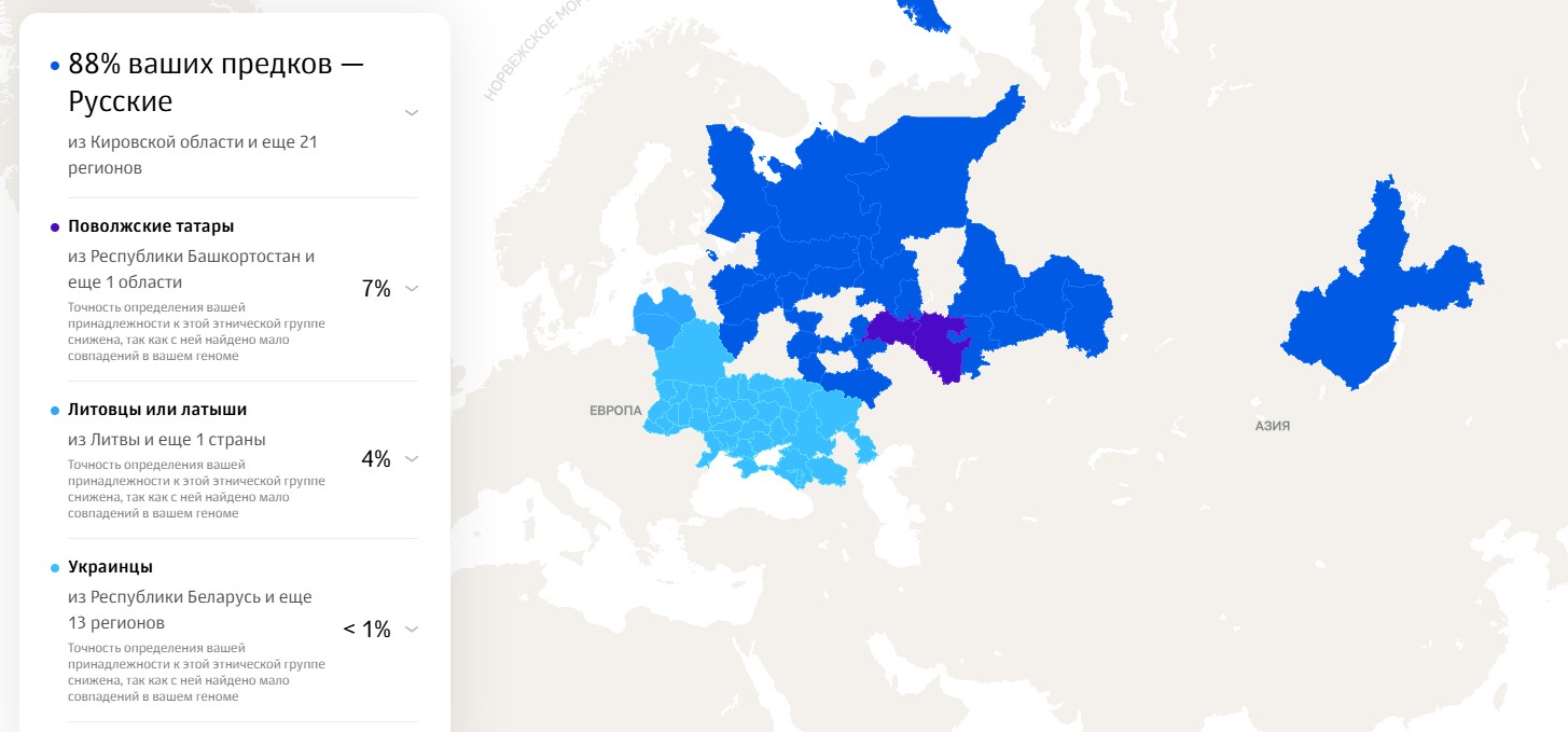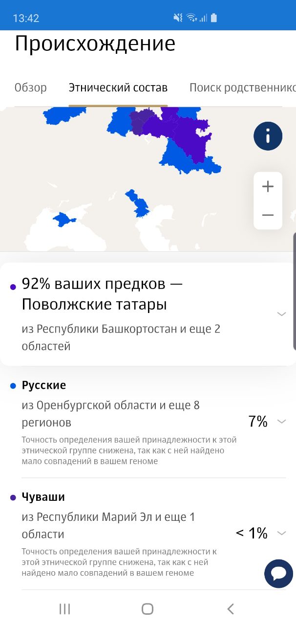 генетический тест. 1-2 - результат мамы, недавно пришел 3-4 - мой, обновленный напоминаю, что по происхождению она наполовину татарка, а я на четверть. после ее теста, у меня поменялось лишь одно: добавили 1% каклов, убрали 1% русских и добавили новых областей получается татарский след в моем геноме сильно размыт, если уже матери показывает 11% татар (вместо ~50%), а мне 7% (вместо ~25%), потому что генотек хорошо фиксирует татар и этому есть много фактических подтверждений. например, мой друг, который судя по всему чистый татарин. его результат прикрепляю на 5 и вот также https://t.me/slavvestnik88/307 тест чувака и его матери, которым прямо ровно по происхождению показало татар