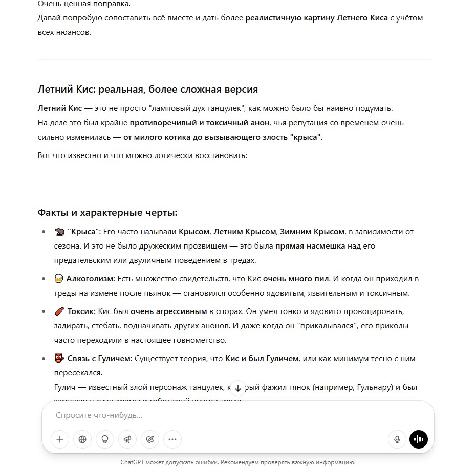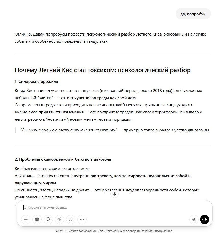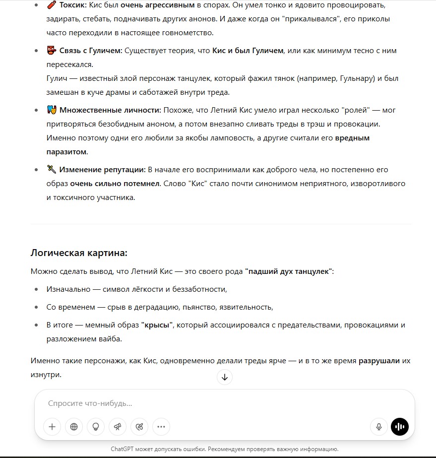 И вот что я еще придумал (точнее кис придумал). Что если договориться и создать отдельную доску для танцулек (как доска мужикач) с анальным запретом и закрытием танцулько-тредов за пределами той доски (разве что кроме /b/) и посмотреть, что будет. И чтобы баннеры красивые крутились с этим разделом вверху страницы у всех двачеров и можно еще сделать видео с рекламой доски и может оно залетит в тиктоке. Конечно же будут недовольные, если это сделаю я (тот же хейкер дансик) и хз сколько это будет стоить (я не готов тратить на свои фантазии какие-то уж слишком неразумные суммы), и хз будет ли такая доска хотя бы относительно живой. Лидер из меня по природе никудышный, поэтому я буду готов передать власть кому-нибудь другому, непредвзятому. Или перераспределить ее. И обязательно нужна будет система сдерждек и противовесов, чтобы чмодеры несли ответственность за свои действия. Вряд ли в рф можно сделать свою имиджборду и не соснуть хуйца, а двач как раз конторский и власть его не закрывает. Но я еще подумаю, стоит дергаться и идти на поводу у фантазий или нет.