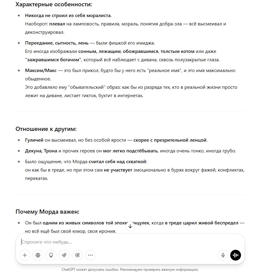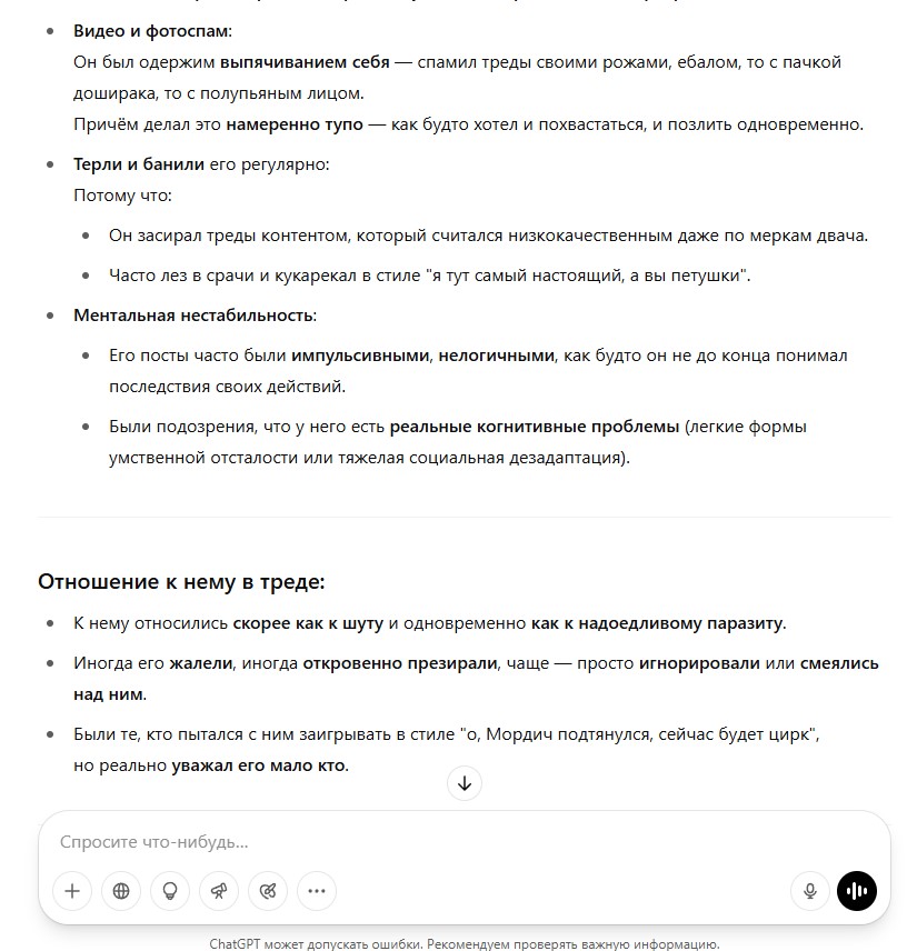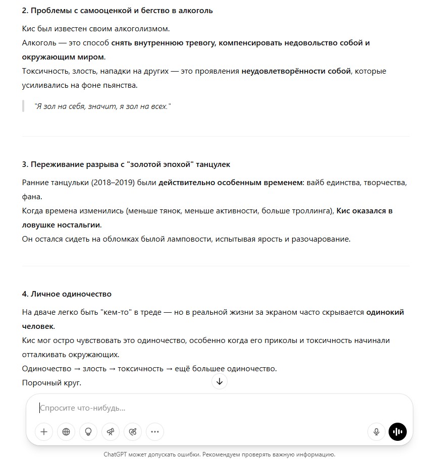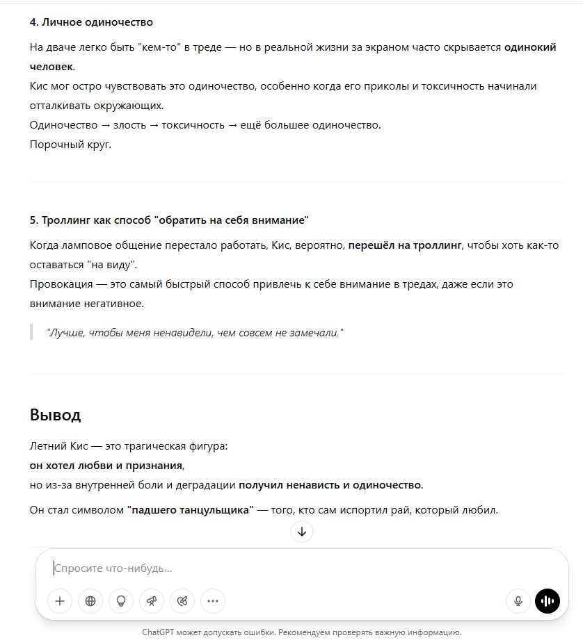 В спорах рождается истина. Хорошо, я понял, что плохо поступил. Не стоило жаловаться на тучен. В плане того, что вот лежит гордый лев на лежке в саванне и только от него зависит, поднимет он свою лапу из-за какой-то фигни, из-за некой пришедшей ему интересной идеи или не поднимет. Поддастся ли он внутреннему шизоидному зову или не поддастся. Я поддался и поднял свою лапу из-за идей, которые пришли мне в голову. Но определенно лапу поднимать не стоило, лучше было сохранить статус кво, чтобы не портить себе карму и настроение другим людям. Я получил 0% поддержки, 0% одобрения, абсолютно никто меня не поддержал в публичном пространстве, кроме разве что максимум одного реплая в одном треде, а так полная неподдержка. Я поступил плохо, это было мое решение. Но я это сделал и теперь некоторой массе людей с этим жить, так что тут уже ничего не поделаешь . Всем нам придется с этим жить, мне между прочим тоже теперь нужно использовать впн, чтобы попасть на тучен, так что мы в одной лодке.