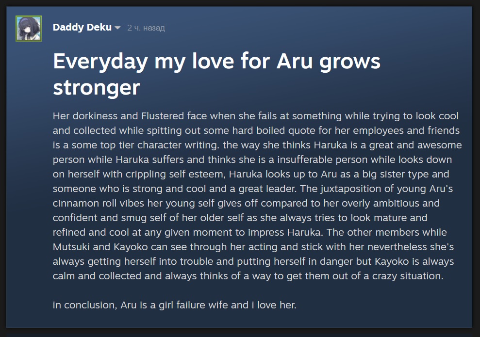 Спасибо студии за предоставленную возможность представить себя на месте и гг и пофантазировать о том, что я тоже встречаюсь с такой пиздатой девчонкой с которой у нас общие интересы. Стаффы в последнее время вообще заебись делают свою работу — третий винчик за год после 2.5дшной Ририсы и Мао 2077.