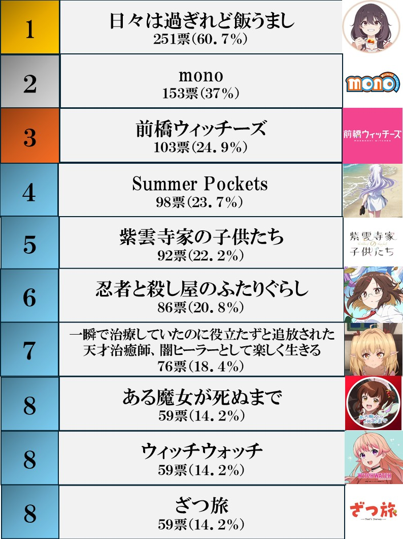 >>1061786 Summer Pockets (правда там 26 серий, но я на 6 или 7 остановился) Lazarus ( глянул 2 серии) Witch Watch (4 кажется) Kowloon Generic Romance (4 кажется) Rock wa Lady no Tashinami deshite (3 серии) Apocalypse Hotel (4 серии) Shoushimin Series 2nd Season (4 серии) Mono (7серий) Подчернутое планирую дропнуть. Жирное досмотрю обязательно.