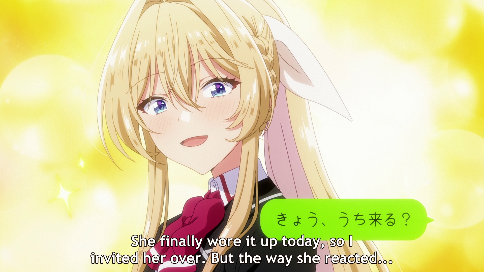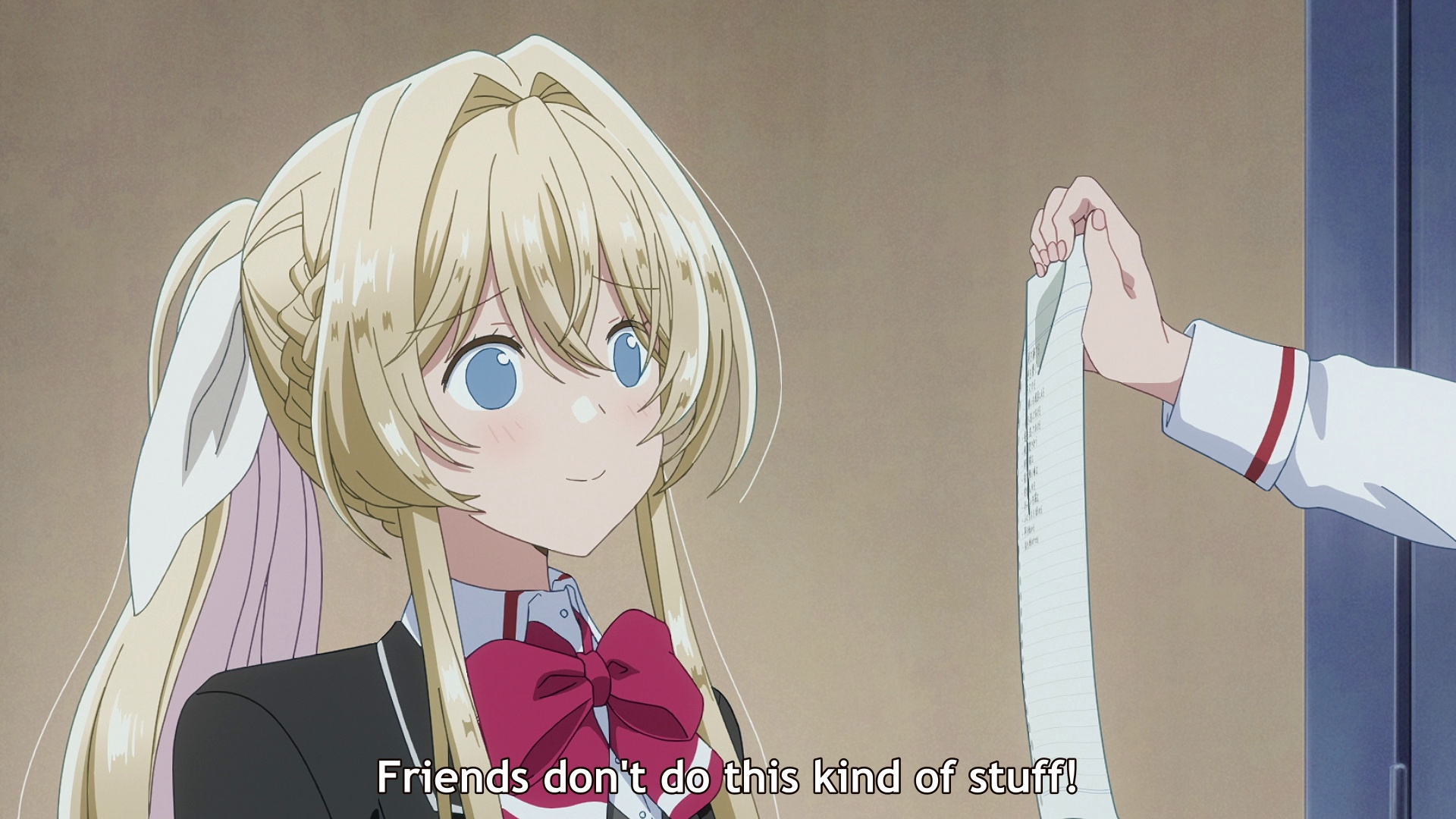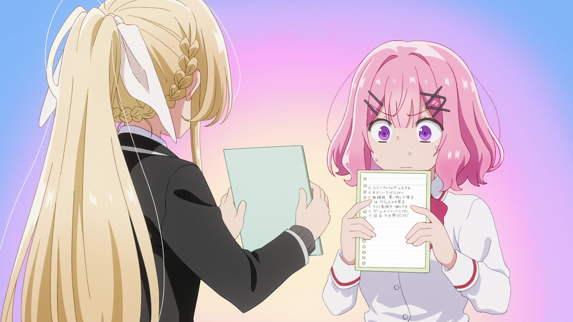 Ну, судя по всему, будет опять смишнявочное говно типа той хуйни про соблазнение злодейки. Но тут хоть девочки красивые, так что можно дать шанс. Да и часть про день пара-день друзья хотя бы потенциально норм идея. Хотя вот эти монологи розовой про Я ХОЧУ БЫТЬ С НЕЙ ЛУЧШИМИ ПОДРУГАМИ такая натужная неестественная чушь, что я просто не могу. Ну что за дружбовлюблённость такая, в которой люди блять мечтают быть с кем-то конкретным лучшими друзьями.
