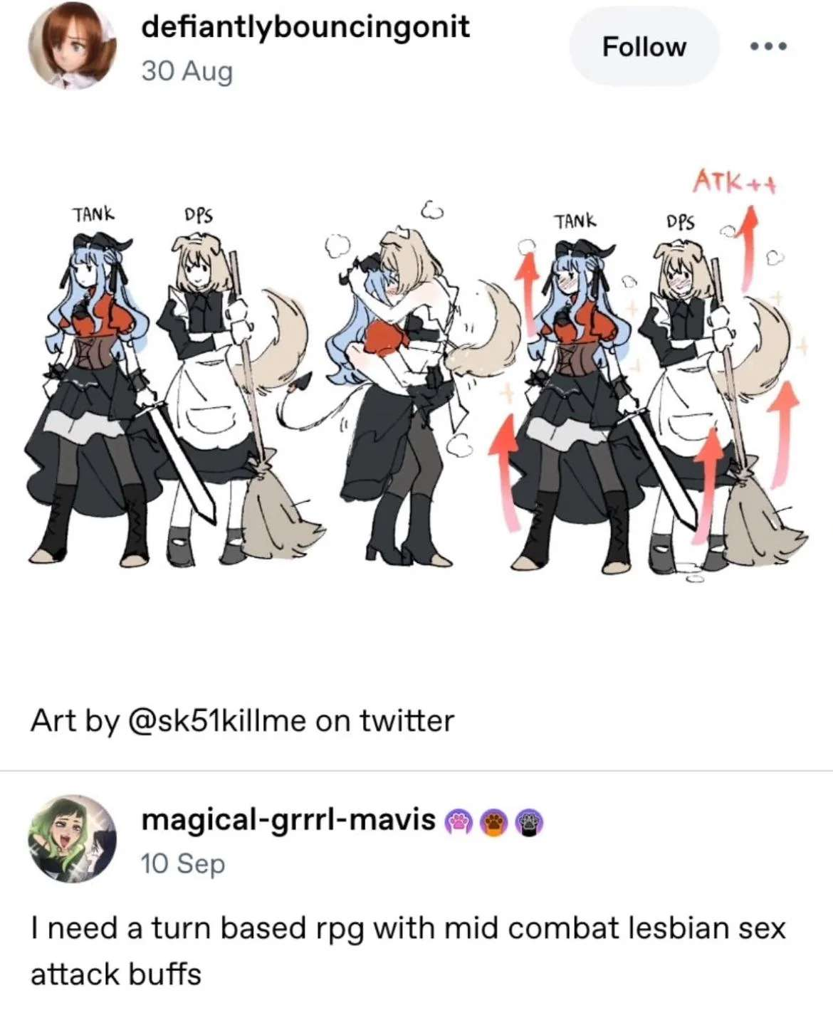 >>1086283 >Если хочешь посмотреть на двух разочарованных людей Если м не тянет двоих - не нужно соглашаться. Если жж не понимают как разыгрывать такую ролевую игру - не нужно соглашаться. Такие забавы не для новичков.