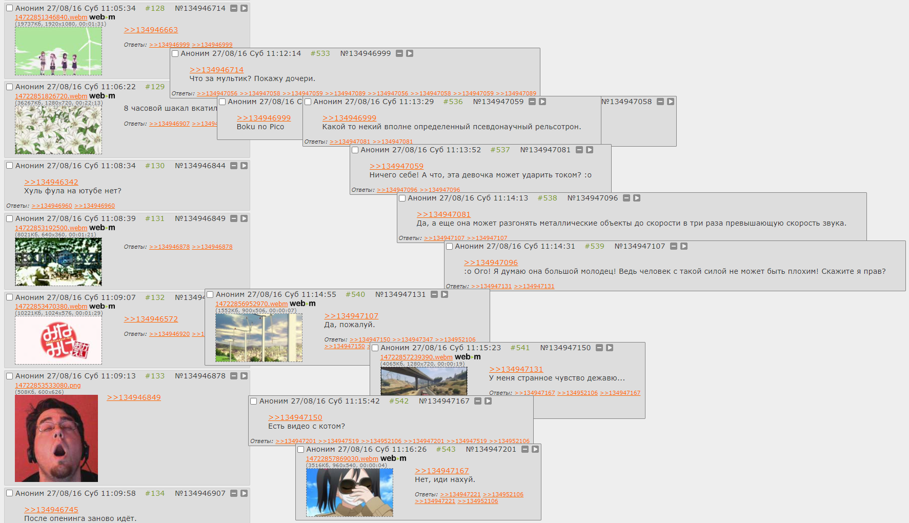 Когда было 10мб лимит все были ближе. В треде обсуждали как конвертить вебм и как запихнуть 3минуты в лимит, поясняли за превьюхи через конкат.