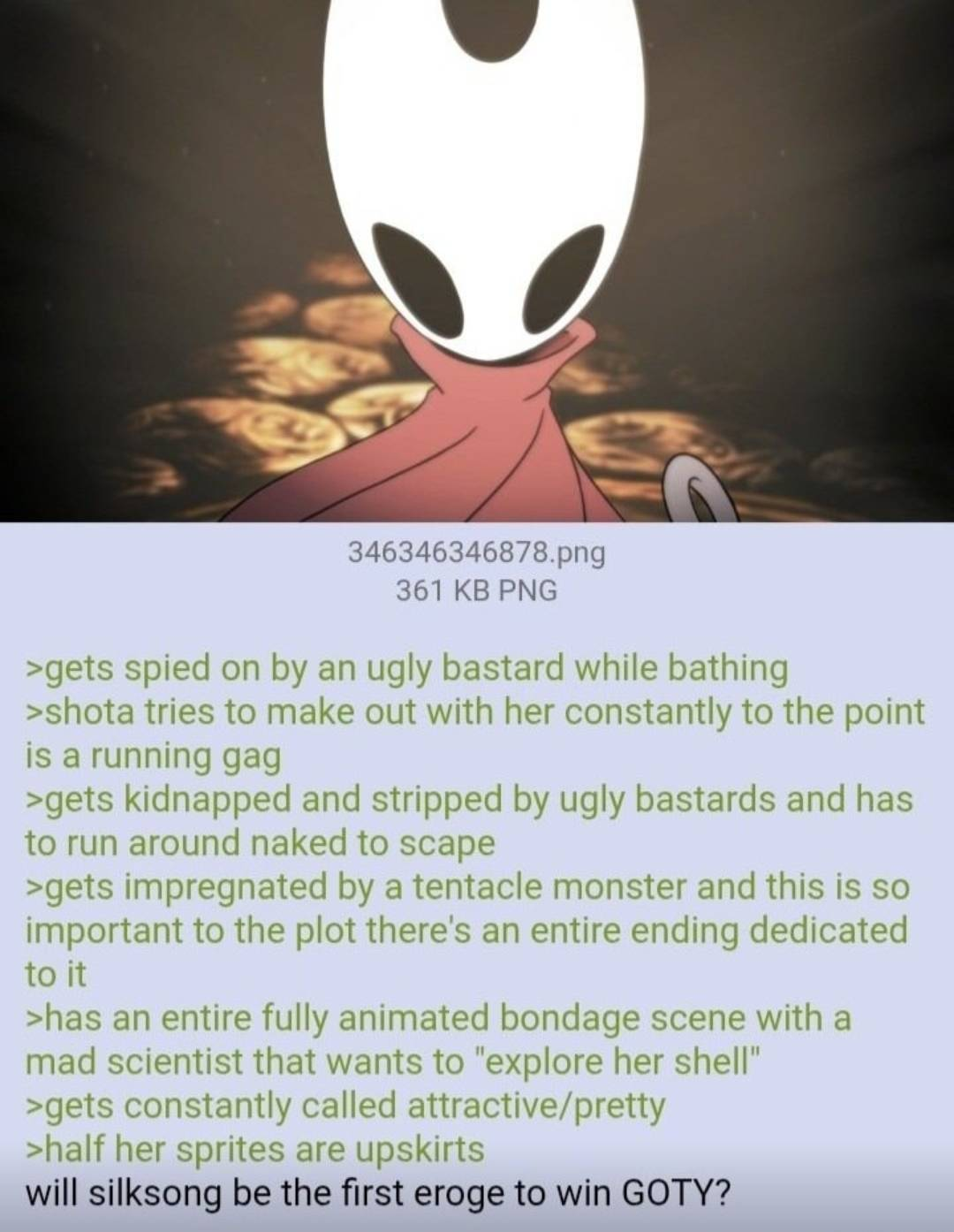 >>1080325 Вот именно такой хуйни хочется в говниме больше видеть, не слоп для подростков с ммо и гаремом, а качественных, хорошо поставленных произведений. У япошек отлично получается экспериментировать с концептами и сочинять всякую дичь, до которой европейцы или амеры разве что под веществами дойдут, а формат аниме и манги позволяет не зажиматься в узких жанрах. Нужно больше экспериментов, а не удоя американских детей на шекели.