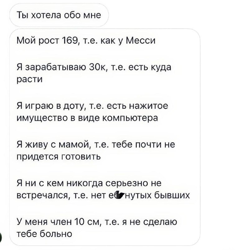 >>1091432 Лол, А ТО! :З Все бабы мира мечтают о старом скуфе с 60к зарплатой, живущим с родителями...