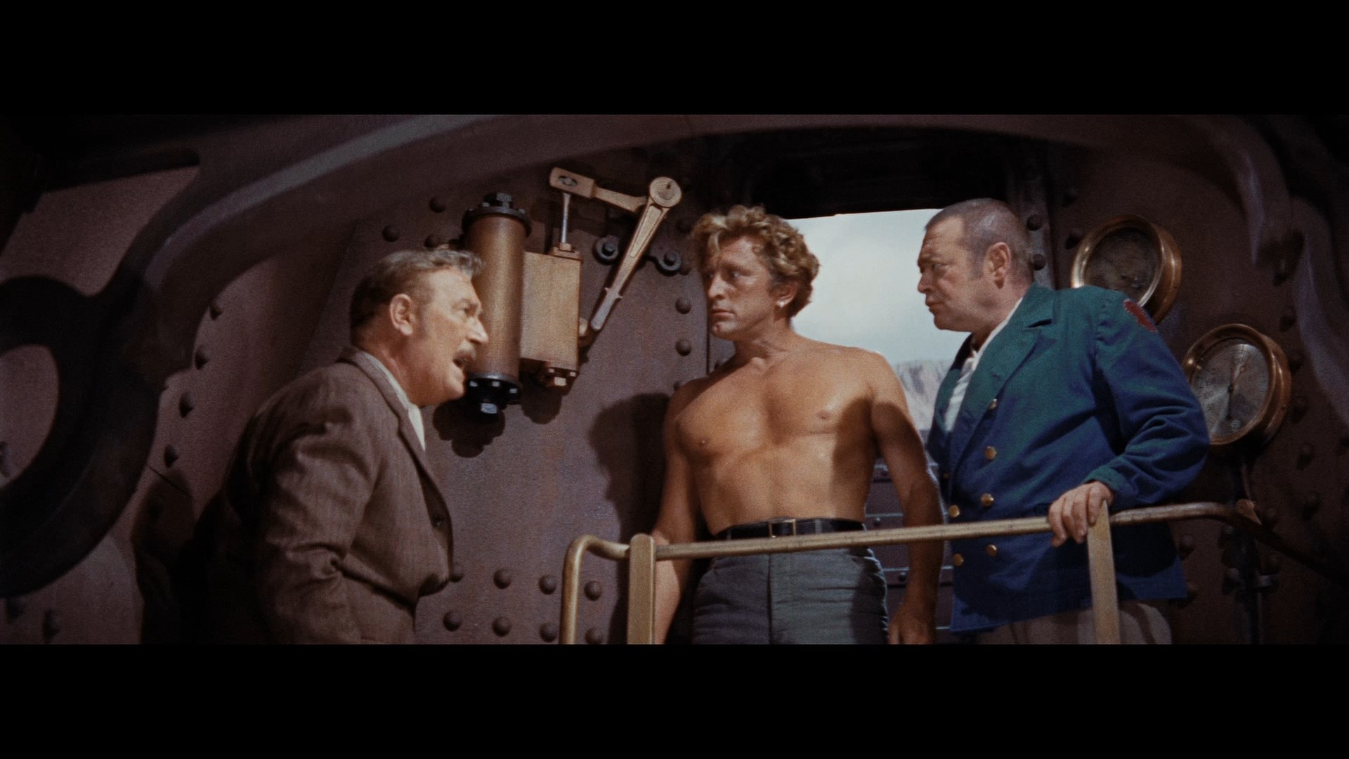 Ещё мудаки новые пассажиры капитана — чмошный профессор и его чмошный комичный помощник. По другой экранизации "20 000 лье", 1997 года, помню, что третьим пассажиром был мерзотный персонаж типичного мудака-морячка и он вообще был на подсосе, так в этом фильме 1954 этого этого чела играл ояебу суперзвезда того времени Кирк Дуглас за 125к зелени при том, что сам фильм стоил 4 миллиона.